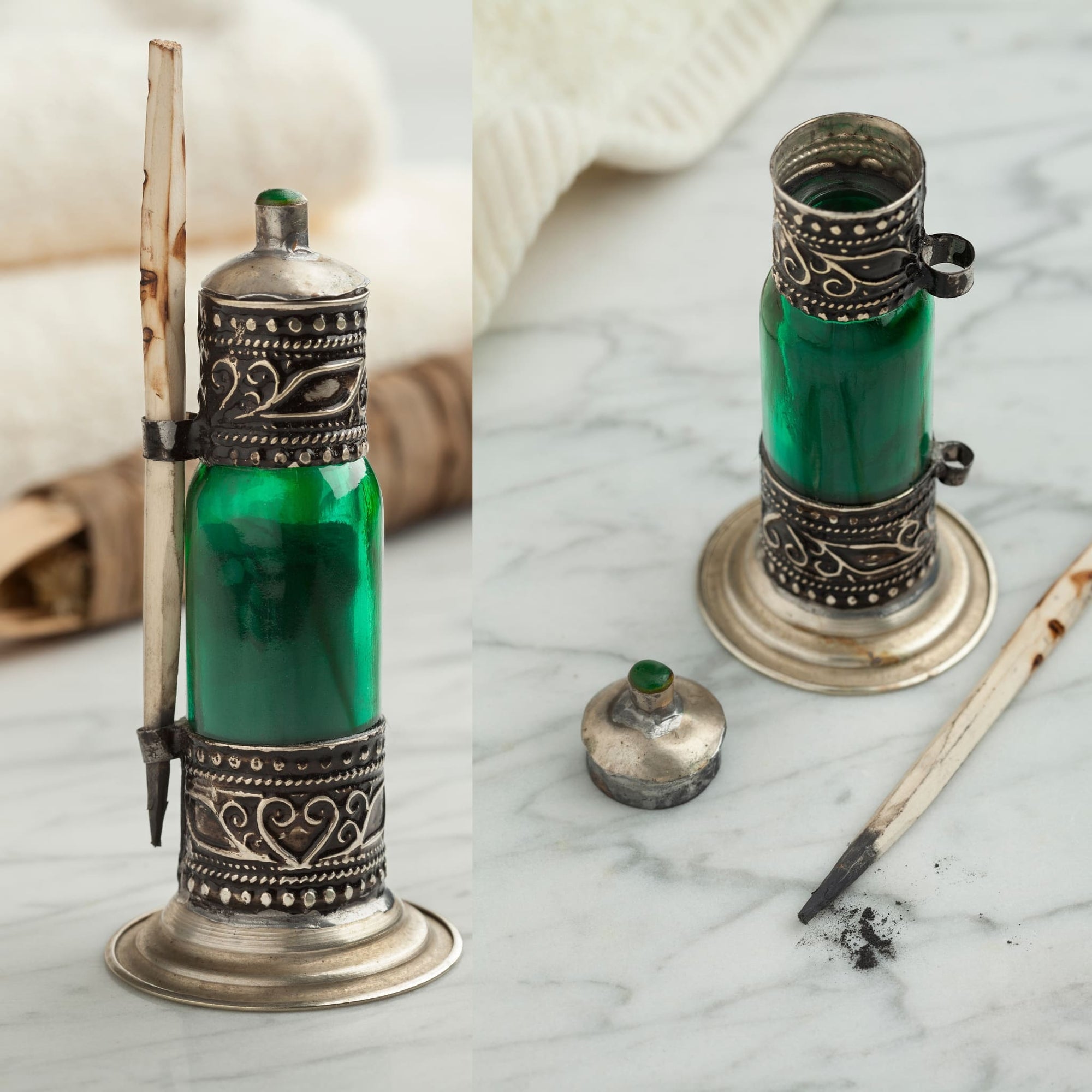 La alpaca trasciende lo visual, ya que es también lo que le confiere una durabilidad y un brillo que realza su belleza. Ideal para guardar perfumes, aromas y esencias concentradas, es funcional y una verdadera pieza de arte decorativa. En la cultura árabe, el acto de perfumarse es considerado sagrado y juega un papel crucial en la seducción y la cortesía.
