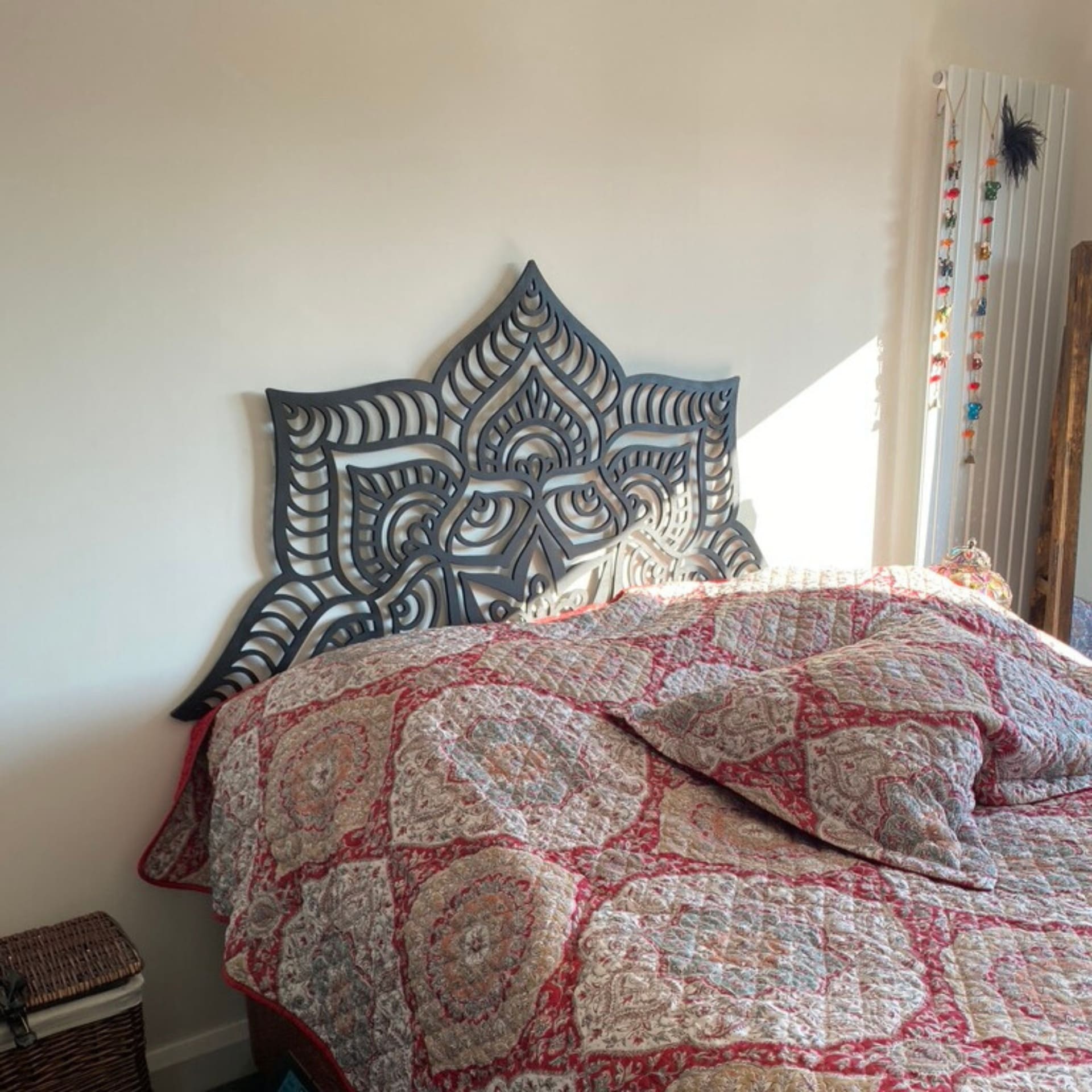 Cabecero de cama de 160cm, fabricado en celosía de madera. Ideal para generar un decorado oriental, moderno y pacífico. Diseño Warda, motivos florales orientales. Creado en madera laminada, incluye los soportes de pared para colgarlo.