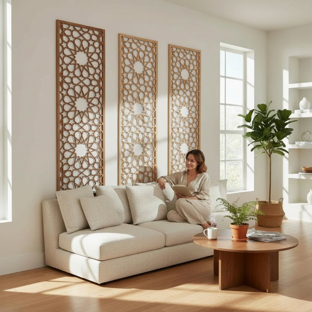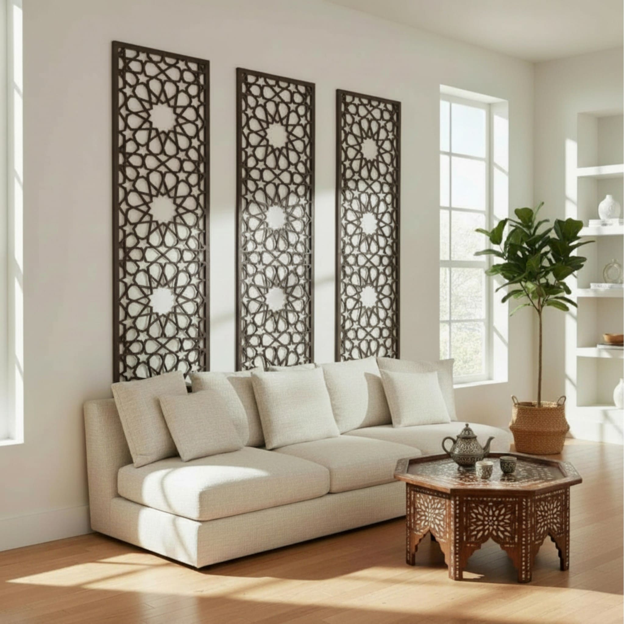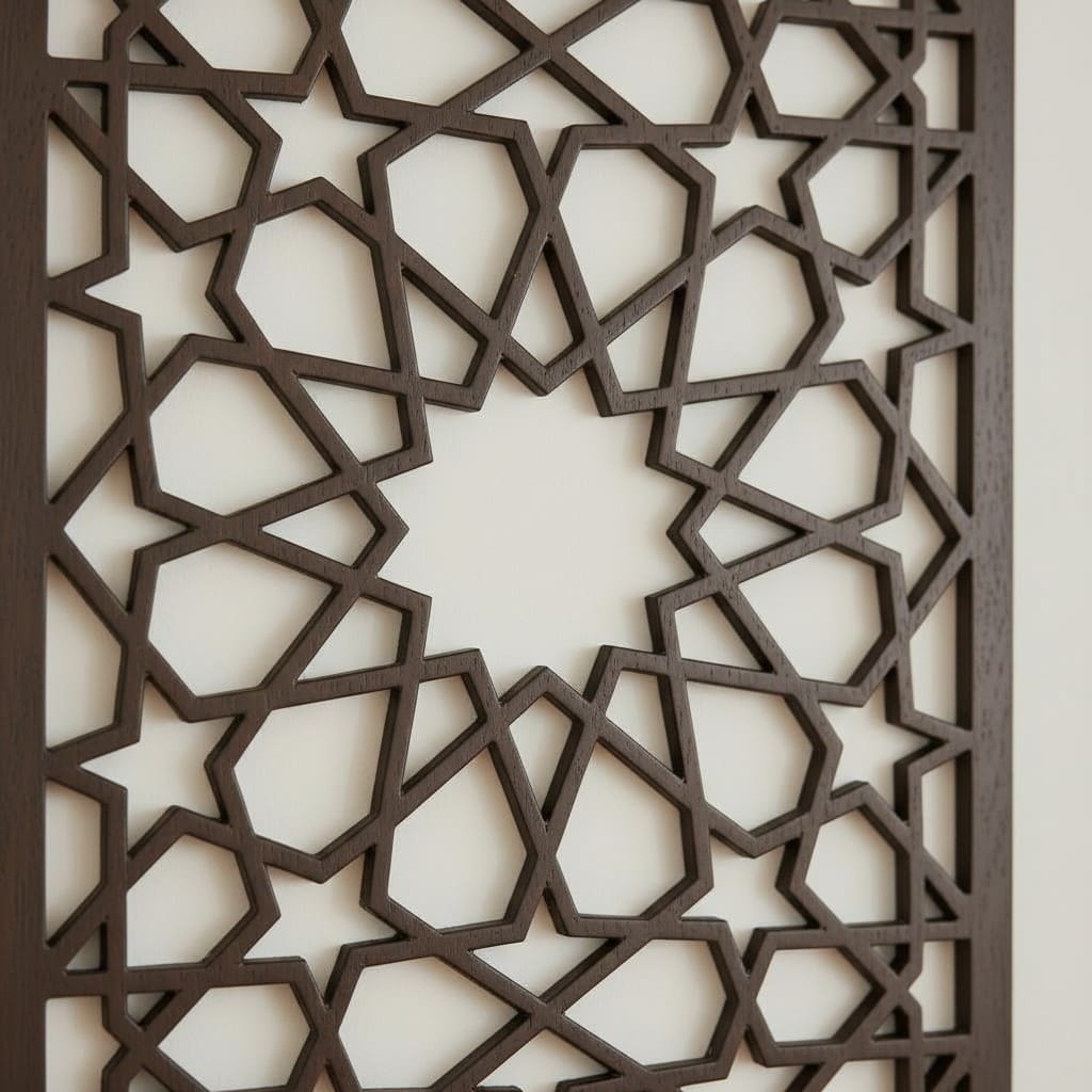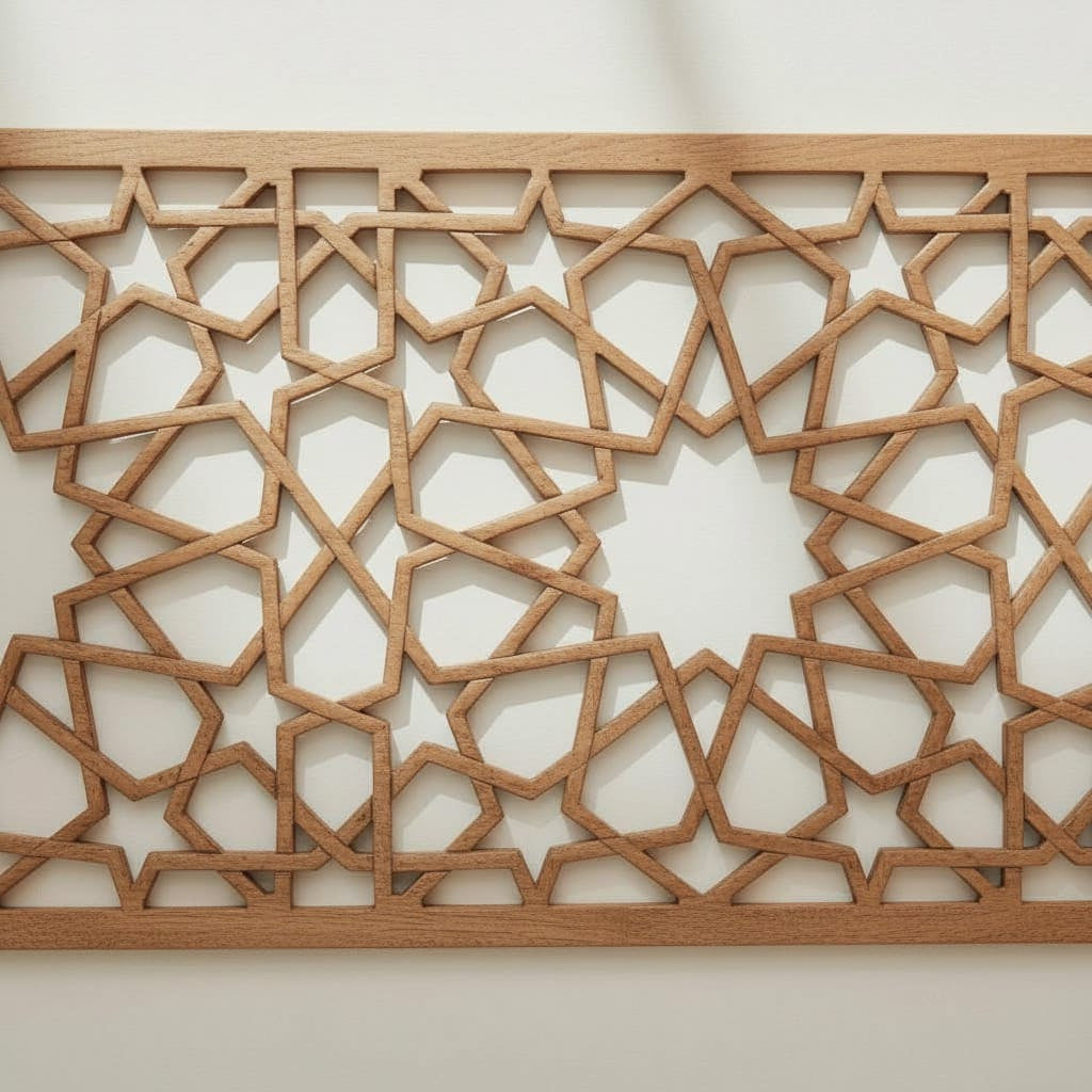 Celosía de madera para aplicación como cabecero de cama o decoración del salón. Diseño inspirado en los mosaicos y cenefas Andalusíes de la Alhambra de Granada. Realizado en madera de 8mm. El acabado puede ser en madera natural o barniz: caoba, wengué, nogal, etc.