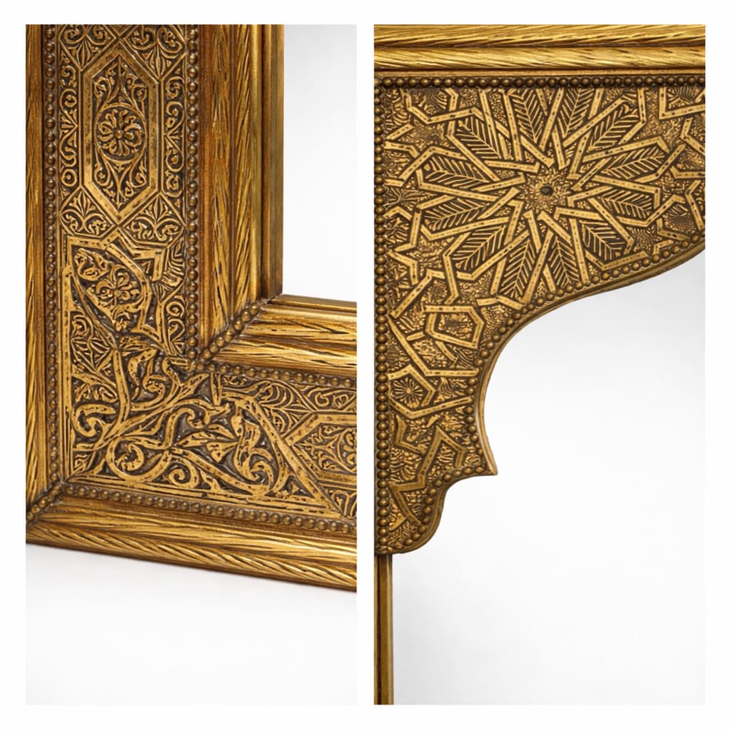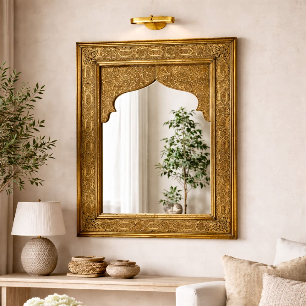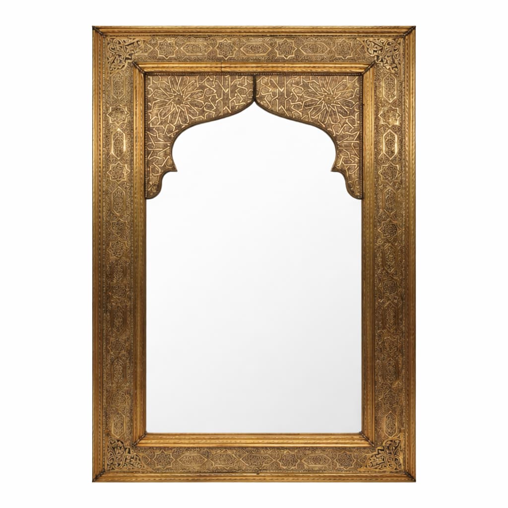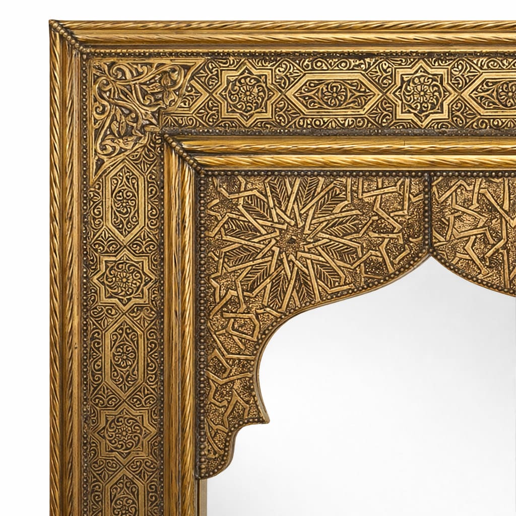 Espejo árabe de alpaca artesano. Elaborado a mano en Marruecos y tallado con motivos florales diversos y gemoetría de Al-Andalus.
