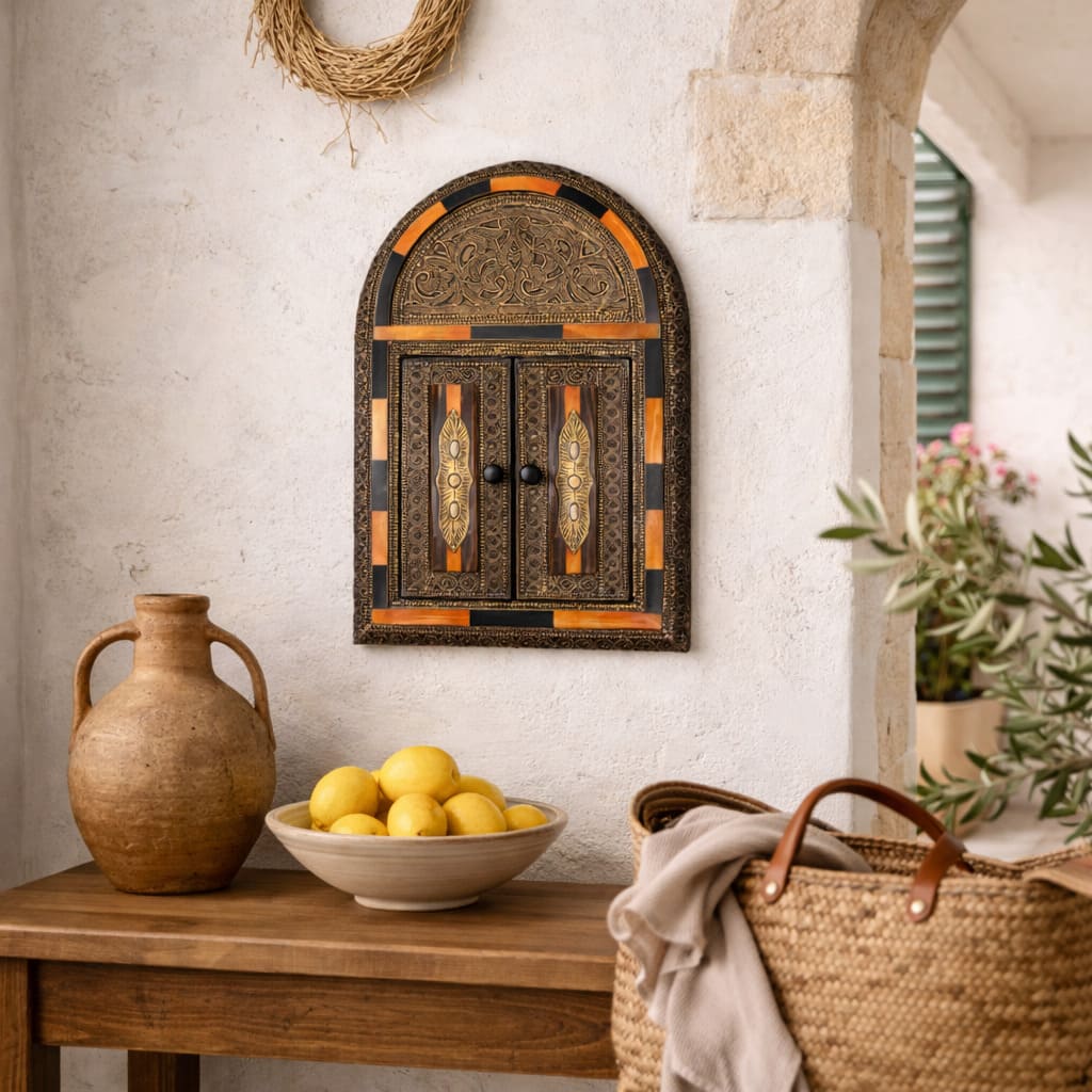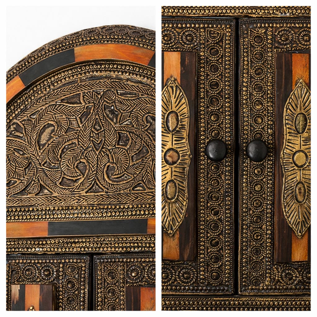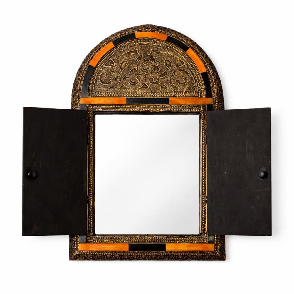 Espejo árabe de hueso naranja y alpaca tallada, diseño Oudayas. Este modelo tiene puerta que guarda el espejo.