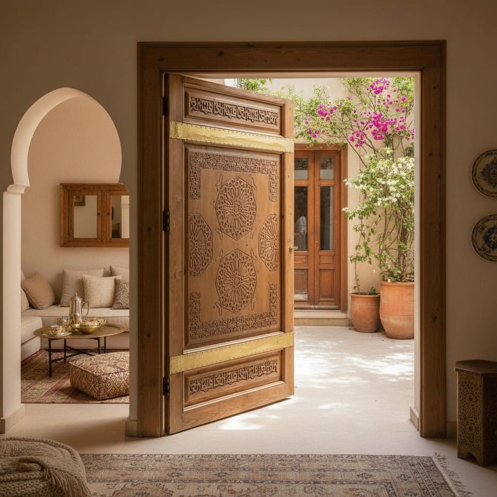 Gran portón Al Andalus, hecho en pino rojo y fabricado por los mejores artesanos de Marrakech, tallado a mano con minuciosidad y con el lujo característico del arte Andalusí.