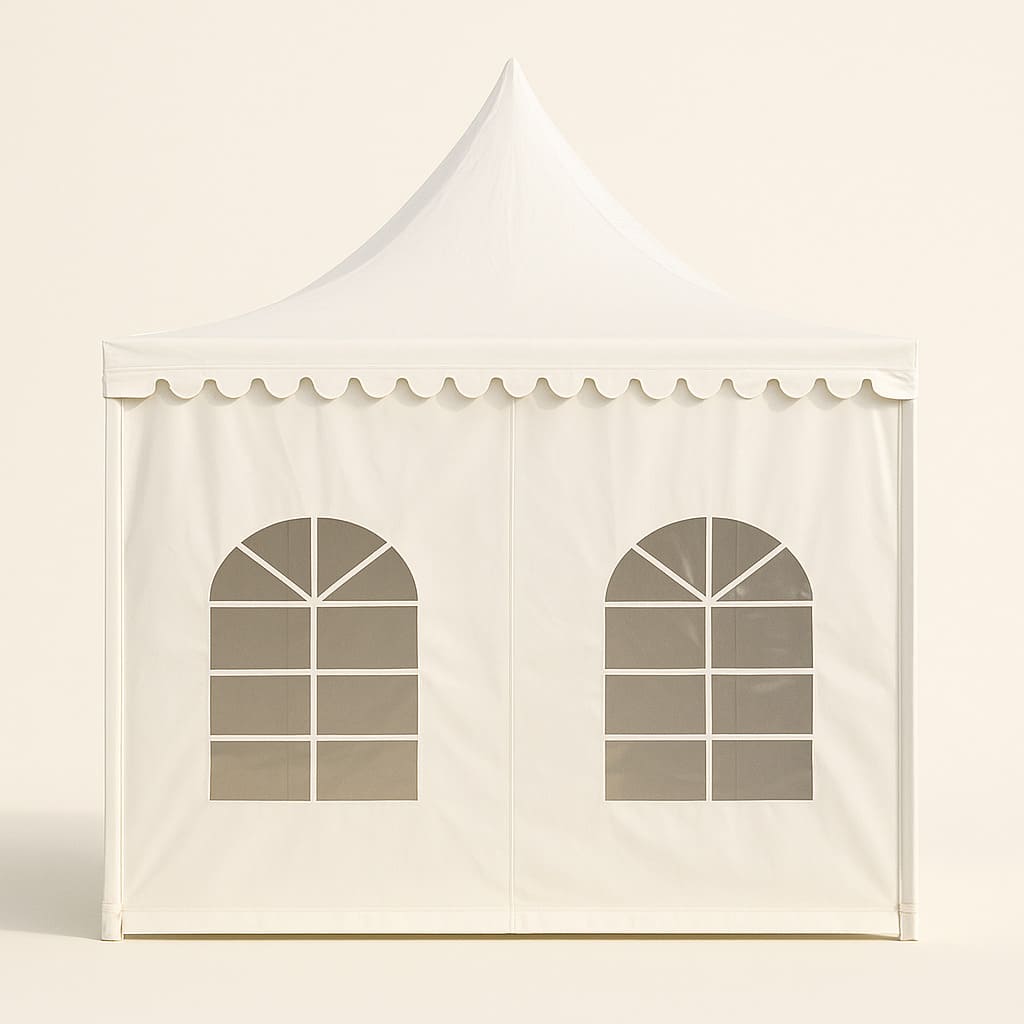 Jaima estilo Medieval, ideal para ferias de muestras, eventos, bodas, etc... Confeccionada con PVC 100% impermeable a mano. Dispone de 4 ventanas. Esqueleto de la estructura en metal.
