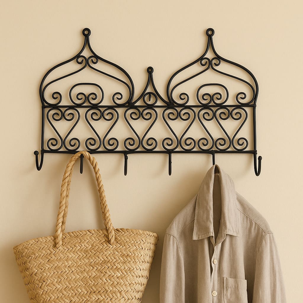 Perchero Árabe Aladino de forja artesanal, inspirado en la decoración marroquí tradicional. Fabricado en hierro forjado negro, destaca por su diseño ornamental con formas arabescas y 6 colgadores resistentes, ideales para abrigos, bolsos o complementos. Perfecto para entradas, recibidores, pasillos o dormitorios, aporta un toque árabe, rústico y elegante a cualquier espacio. Una pieza decorativa y funcional hecha para durar.
