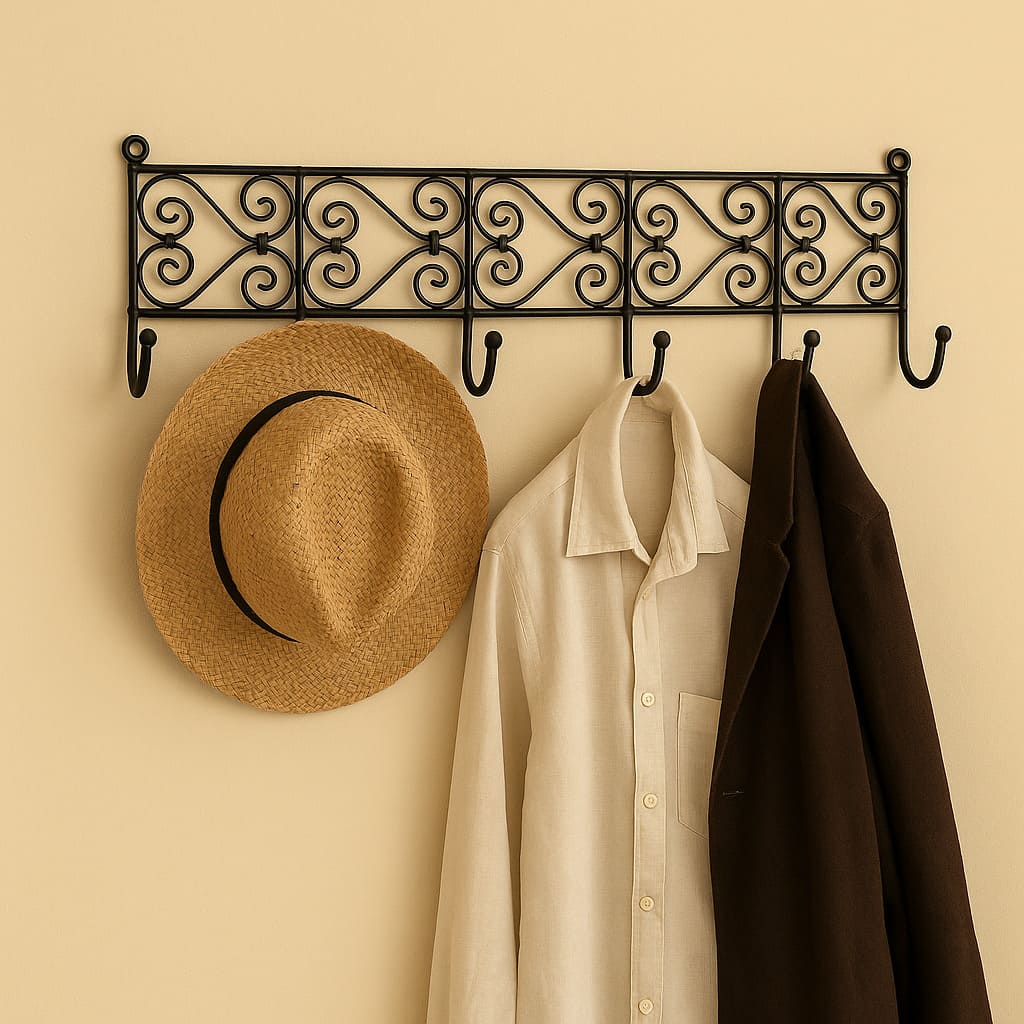 Perchero Árabe de Forja Arruit con 6 colgadores: un perchero mural artesanal de estilo marroquí, fabricado en hierro forjado negro mate con 6 colgadores resistentes, perfecto para organizar abrigos, bolsos y prendas en la entrada o el recibidor. Su diseño tradicional inspirado en la artesanía árabe aporta un toque decorativo auténtico y funcional a cualquier espacio del hogar.