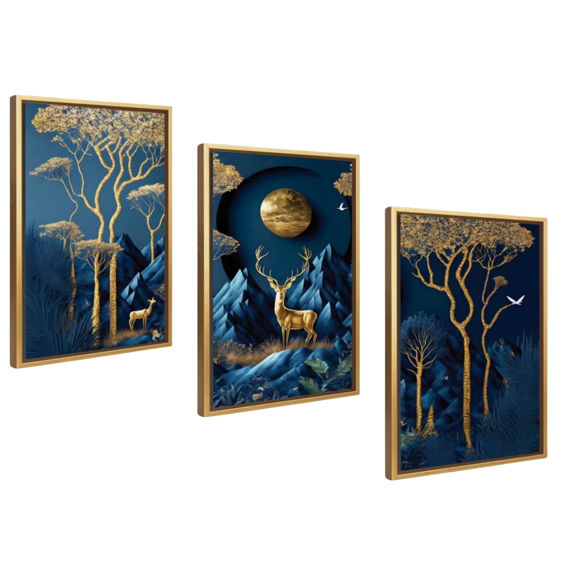 Set de 3 Cuadros de motivos de la naturaleza y ciervos, en marco de madera maciza de lujo. Concebido para espacios decorativos minimalistas, modernos o de estilo contemporáneo.