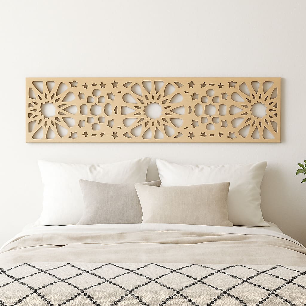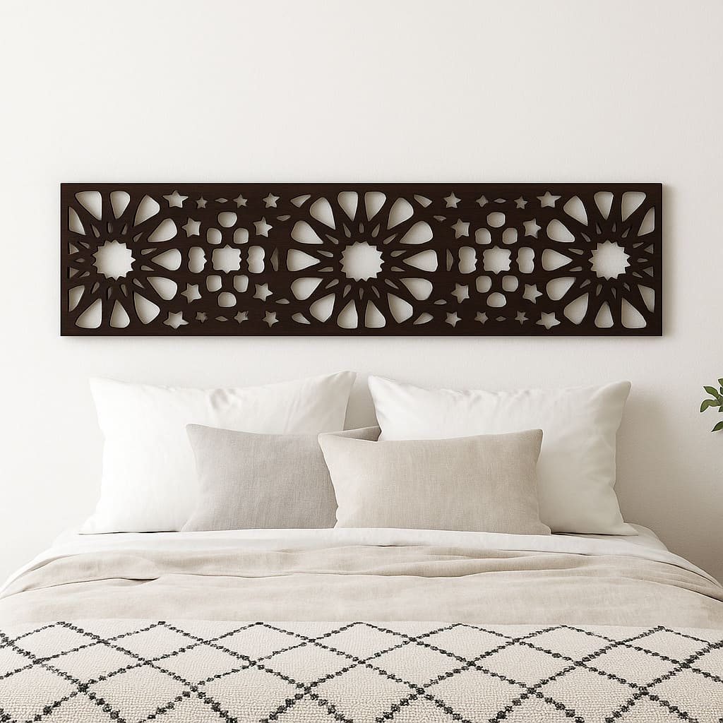 Celosía de madera como cabecero de cama, nuevo Diseño Aladino, fabricado en madera de 1cm de grosor. Se puede utilizar como cabecero de cama, cuadro decorativo para una pared... Decoración árabe y marroquí. Diseños morunos inspirados en la majestuosa Alhambra de Granada y sus patios del Generalife.