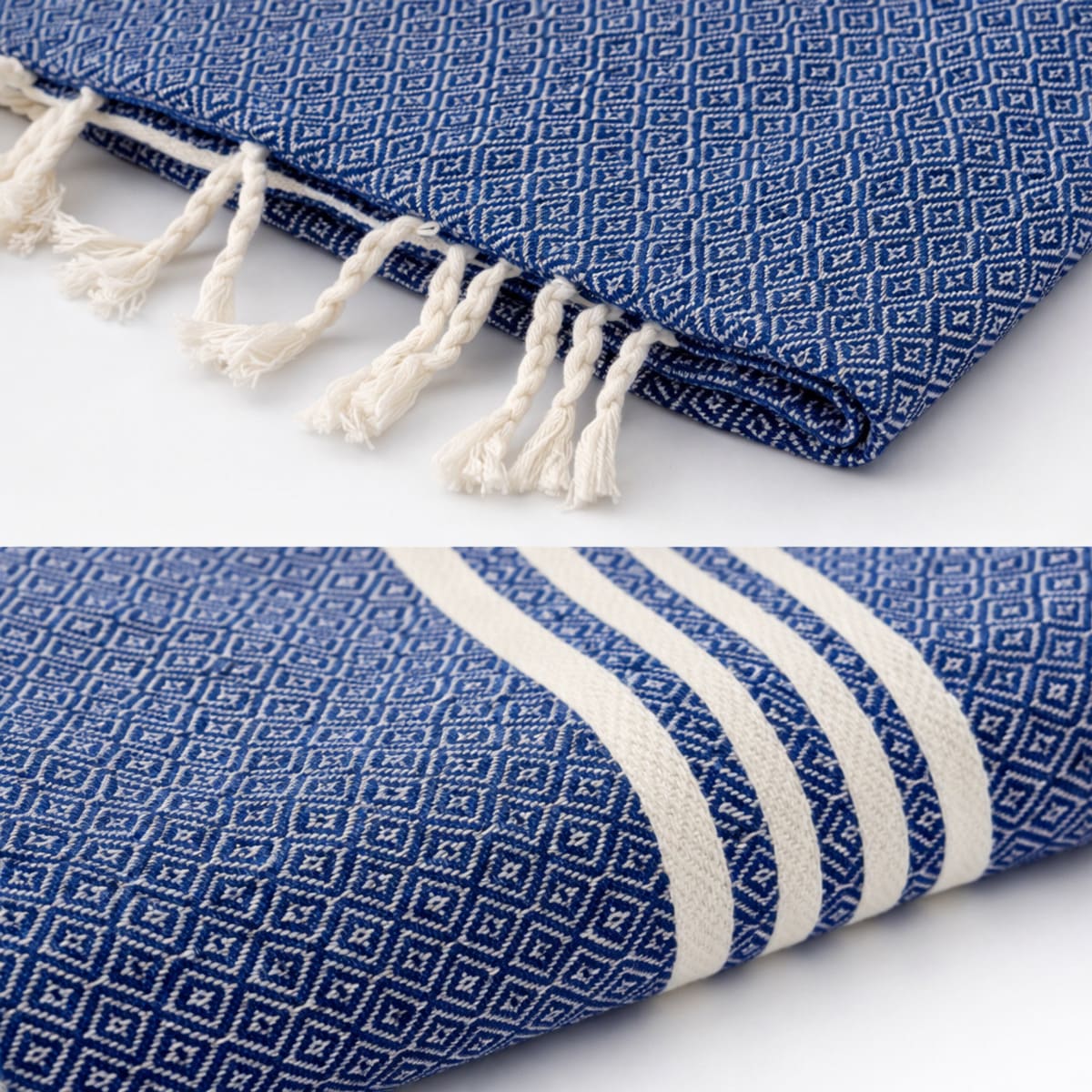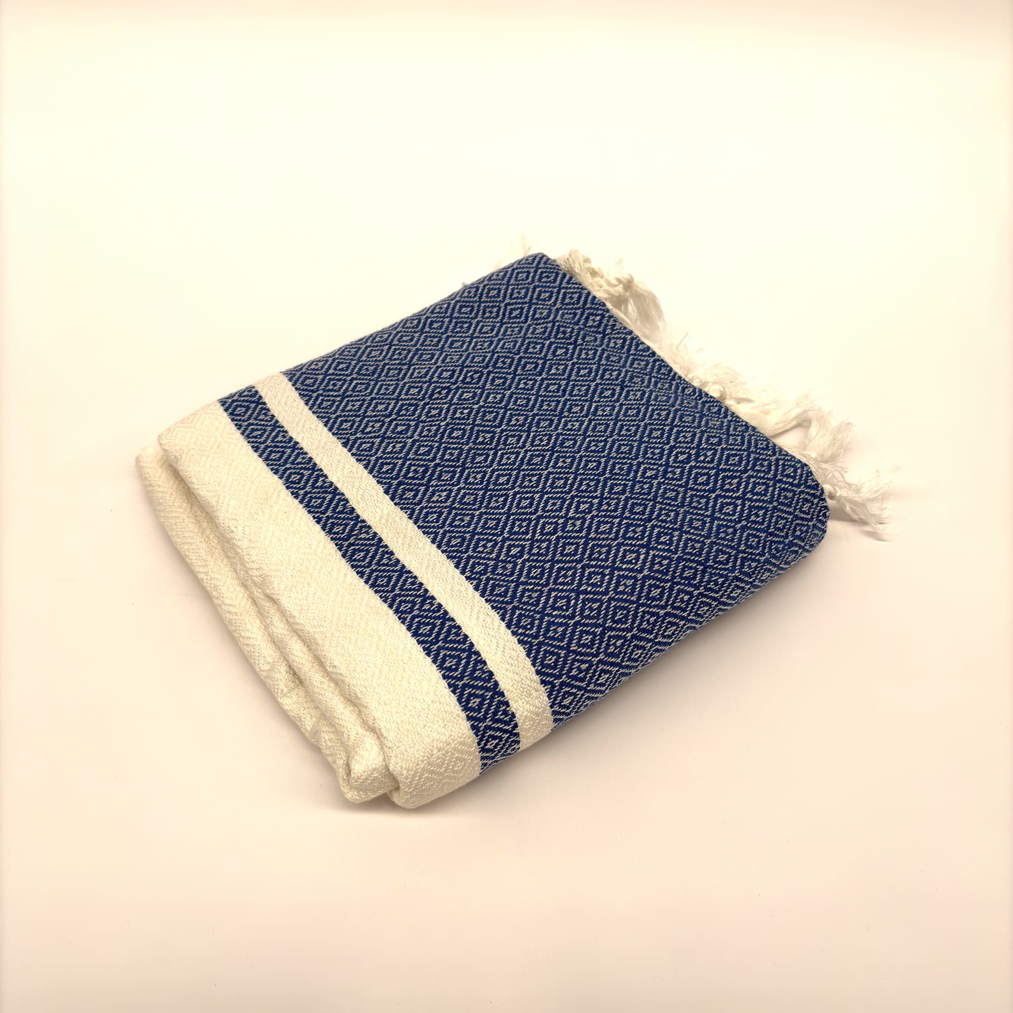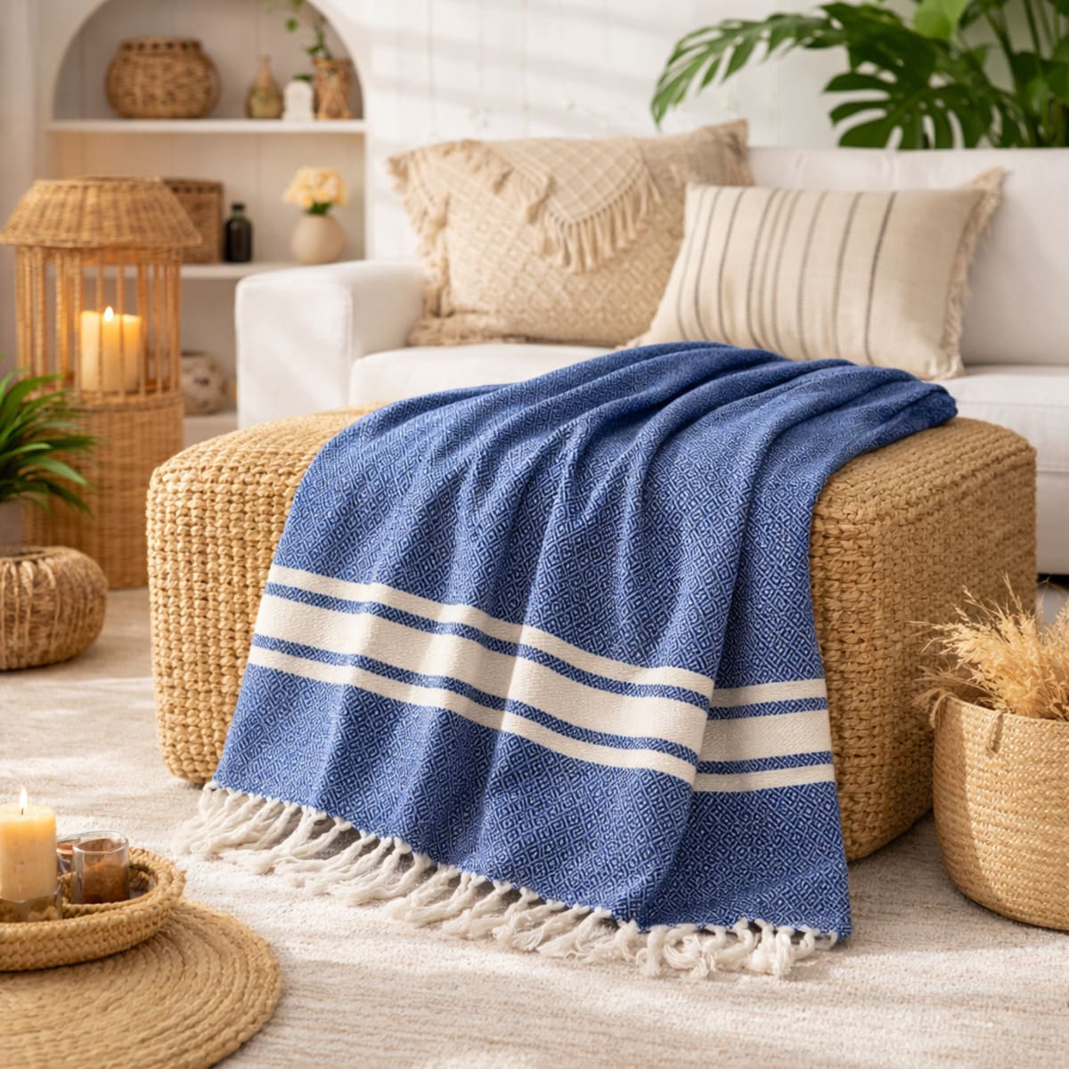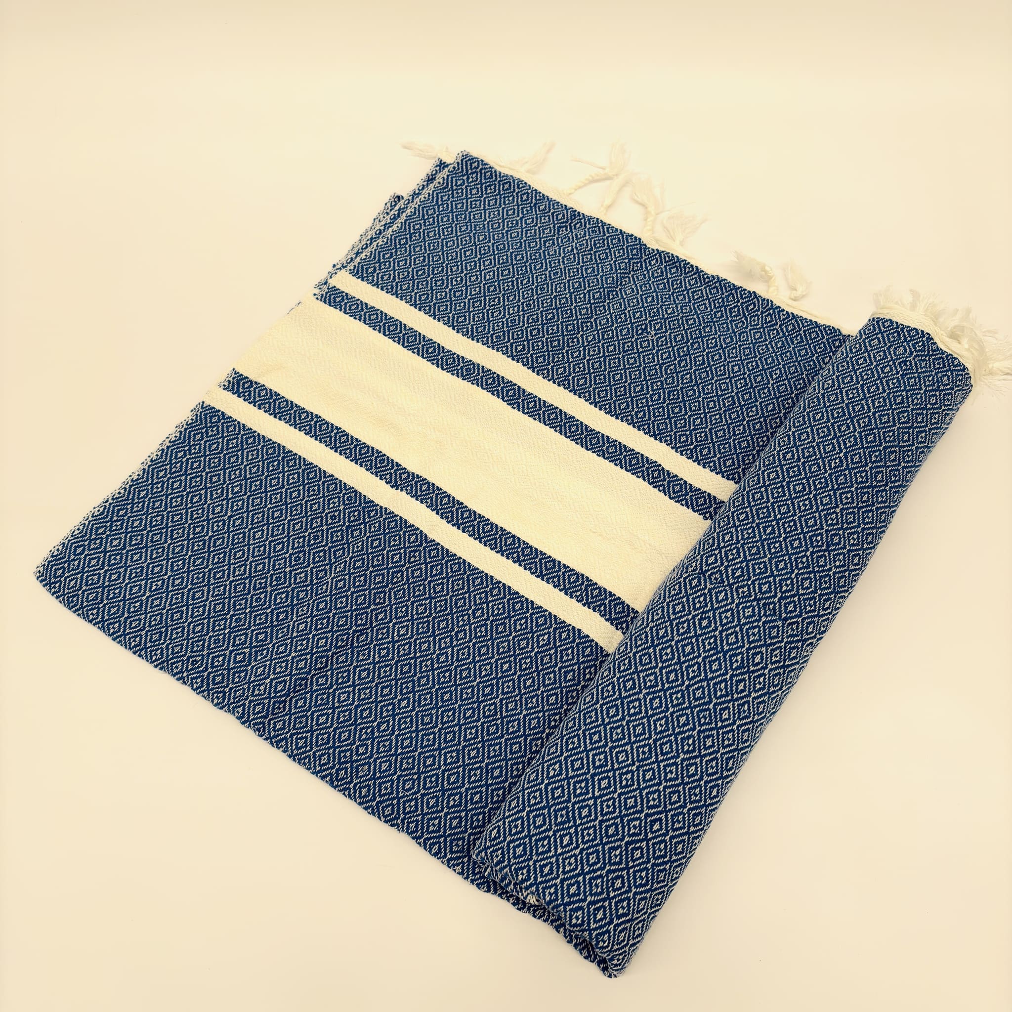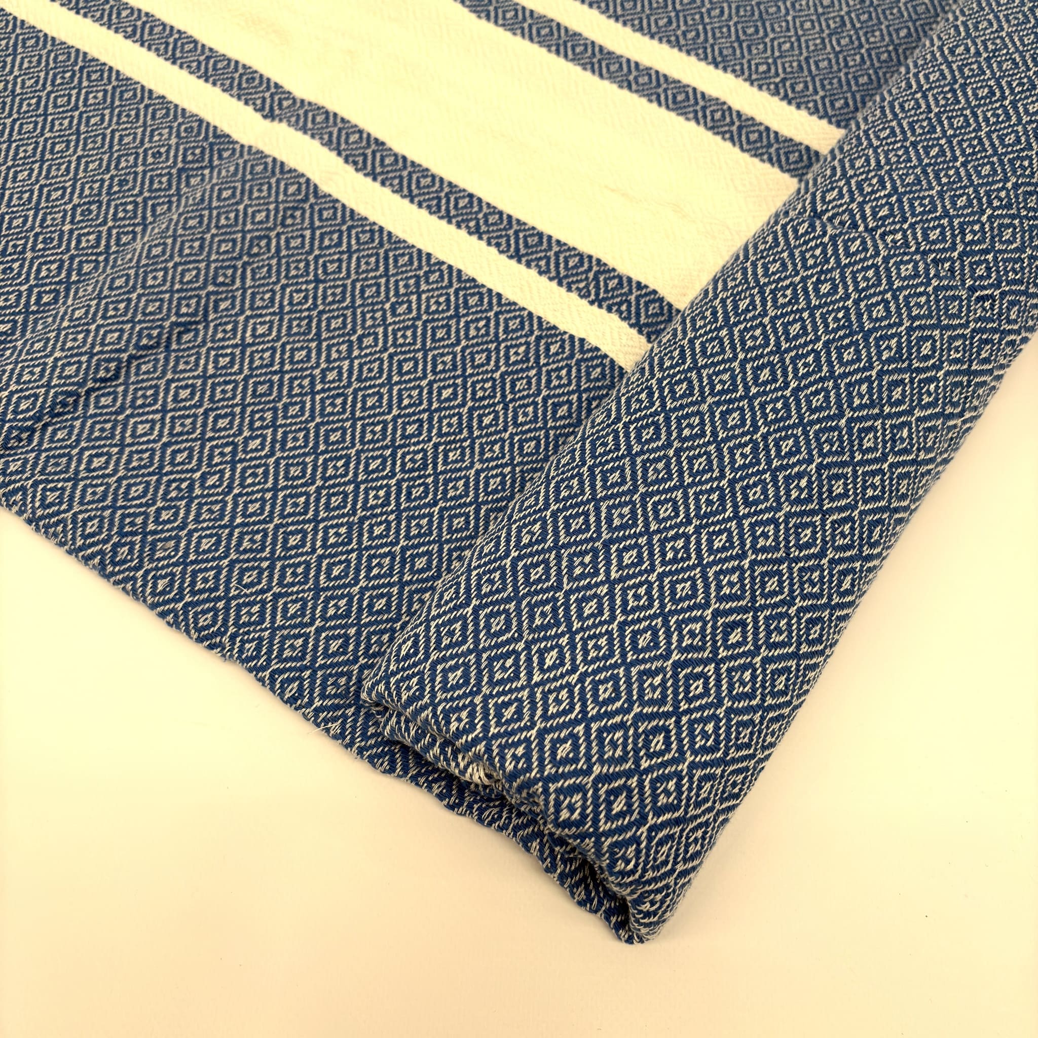 Colcha de Marrakech hecha a mano en azul y blanco. Motivos romboidales y flecos decorativos. Ideal para sofá o cama.