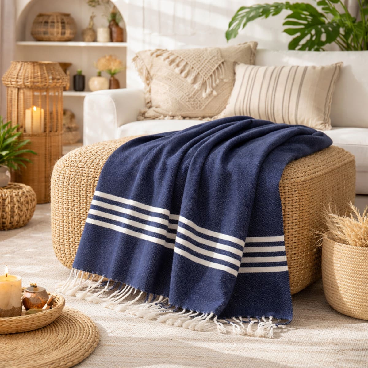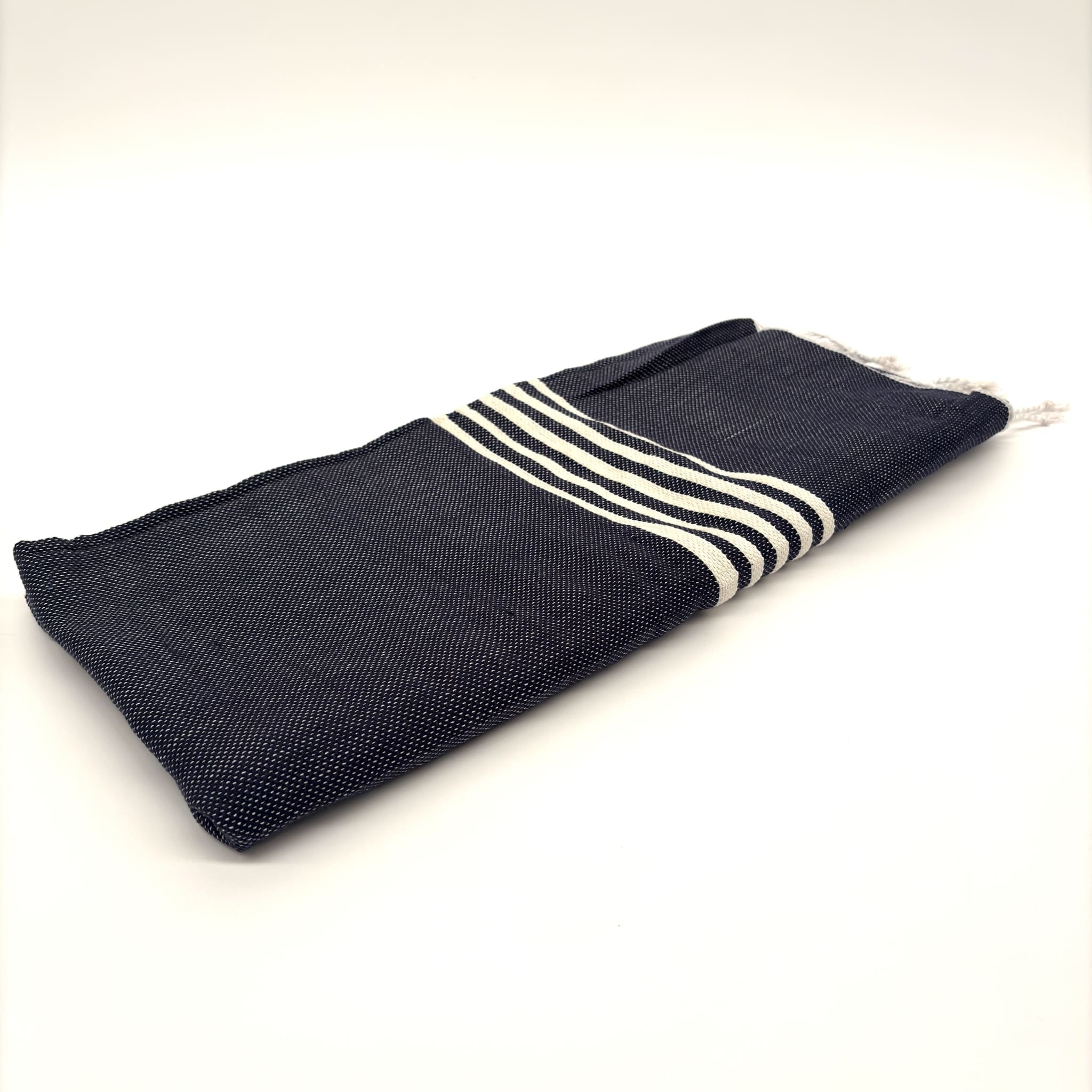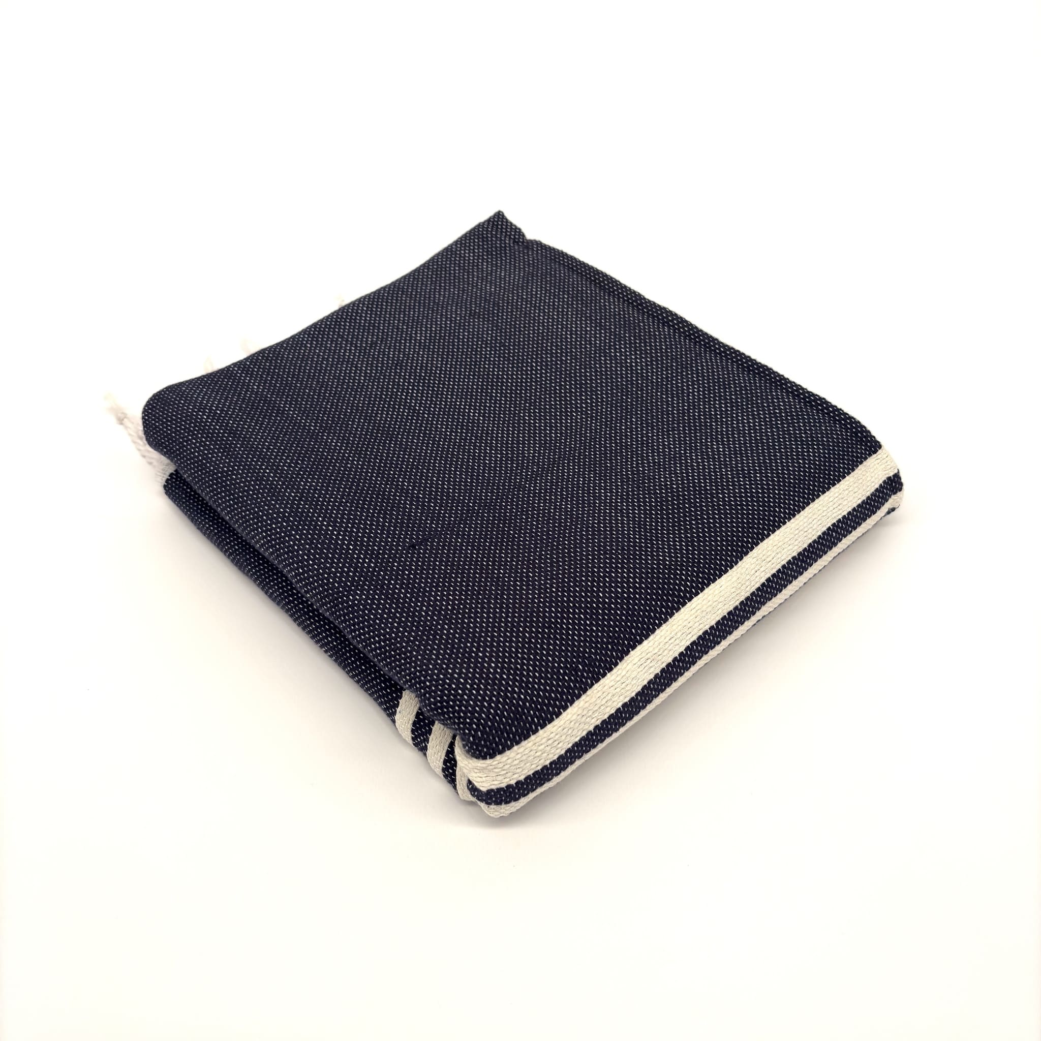Colcha de color azul marino y blanco con flecos, elaborada artesanalmente en Marrakech(Marruecos) con 100% algodón. Ideal para sofás y camas.