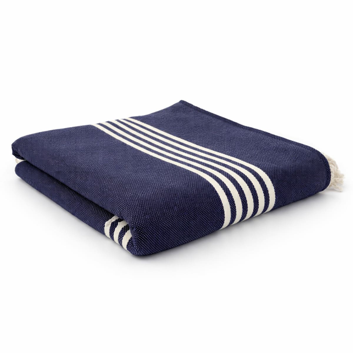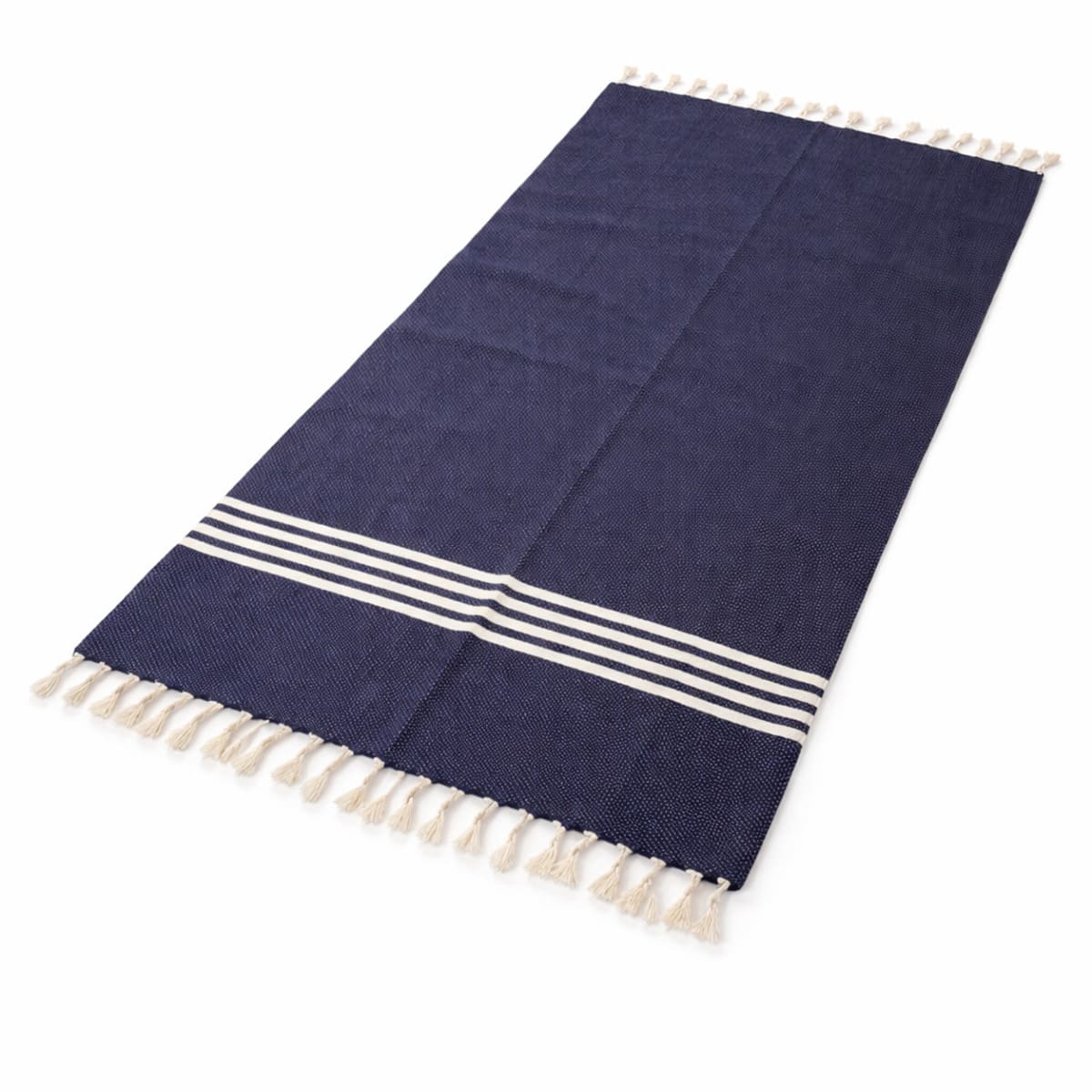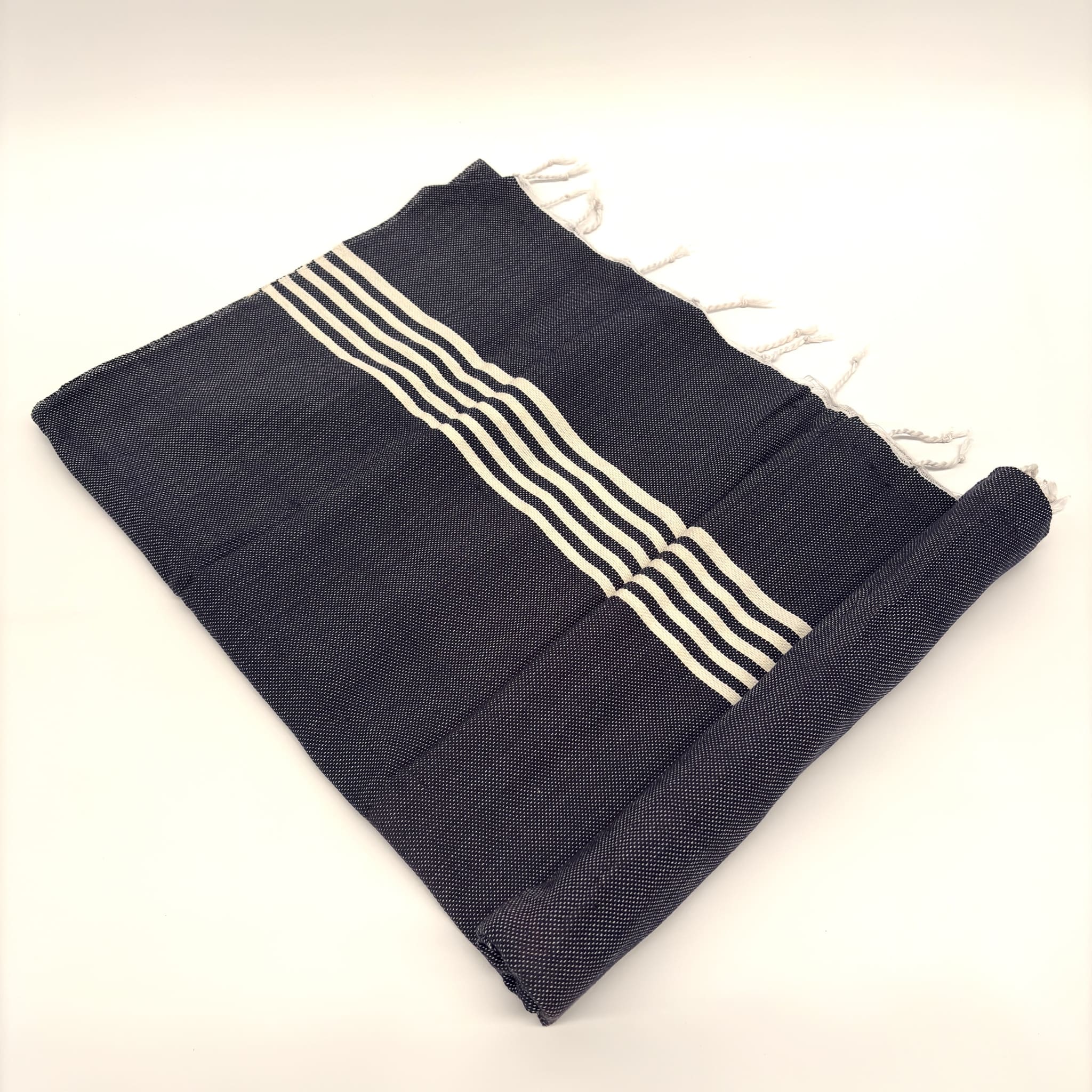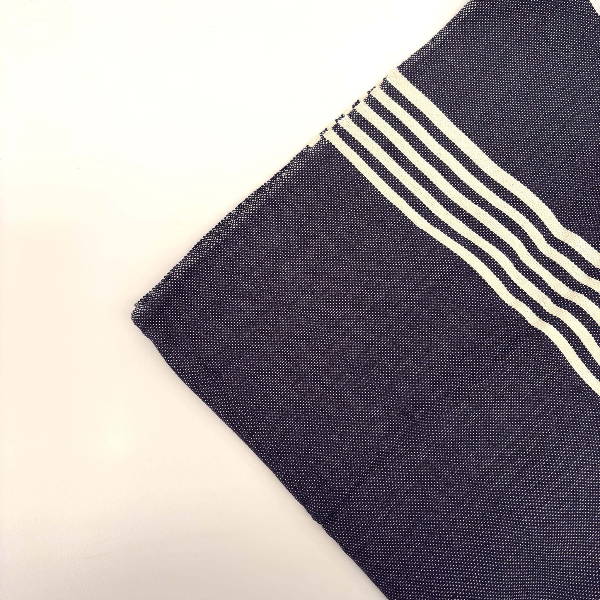 Colcha de color azul marino y blanco con flecos, elaborada artesanalmente en Marrakech(Marruecos) con 100% algodón. Ideal para sofás y camas.