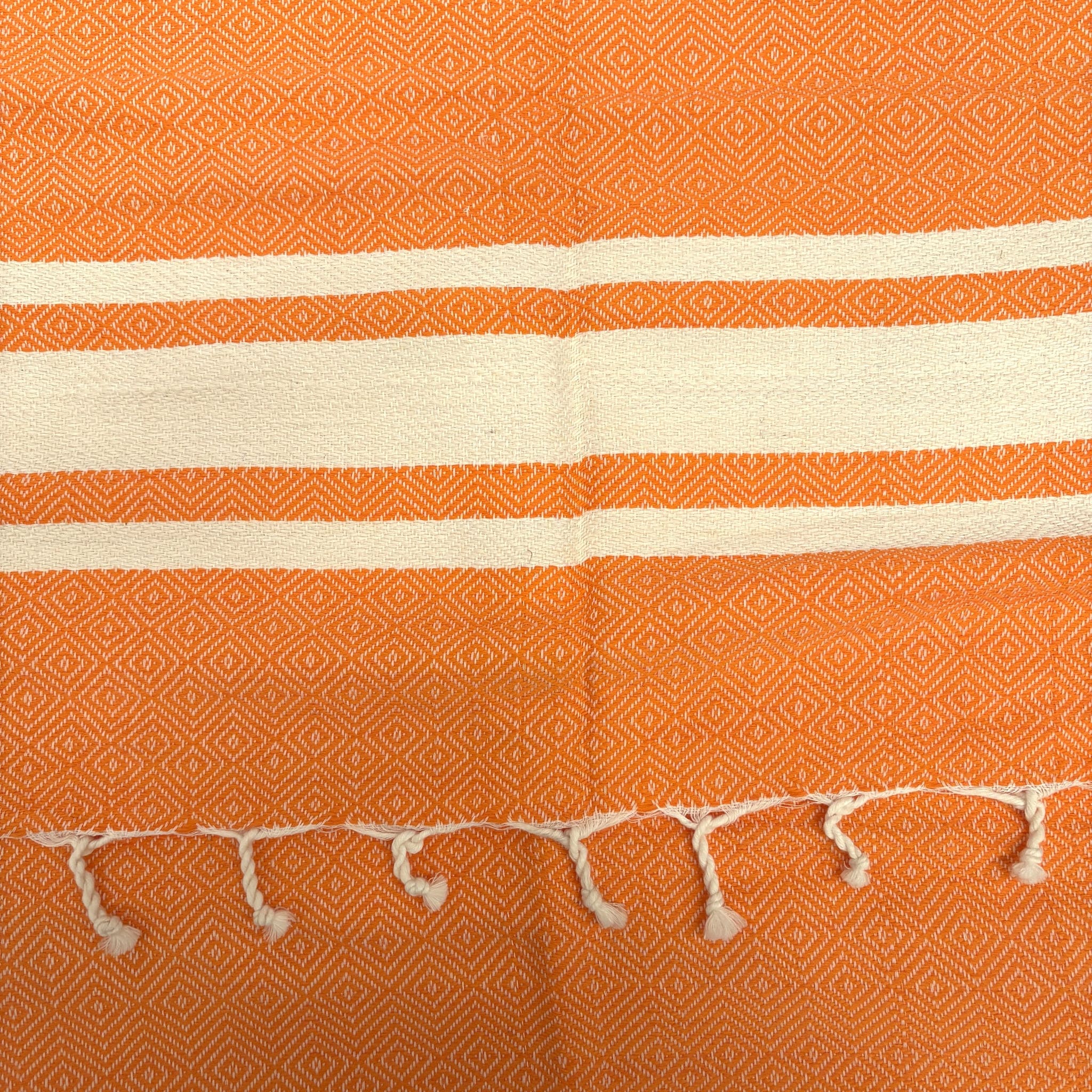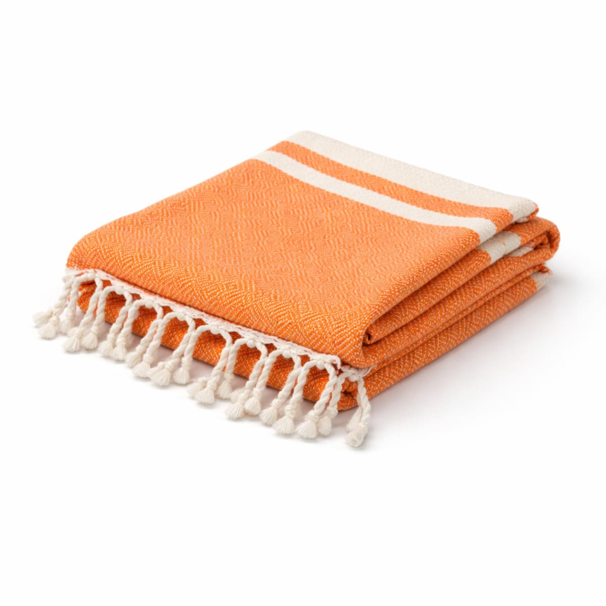 Colcha de Marrakech en naranja y blanco con flecos, 100% algodón y hecha a mano.