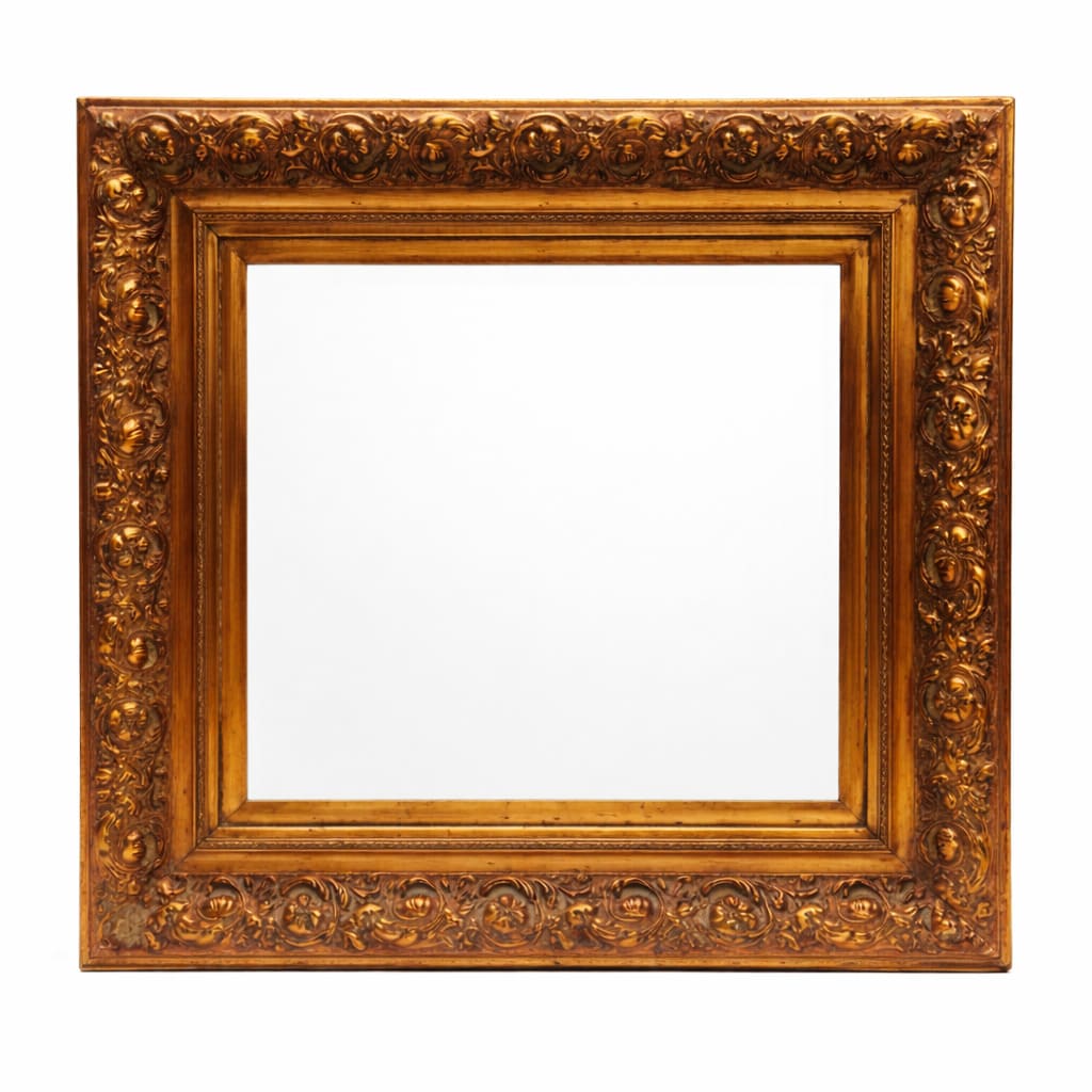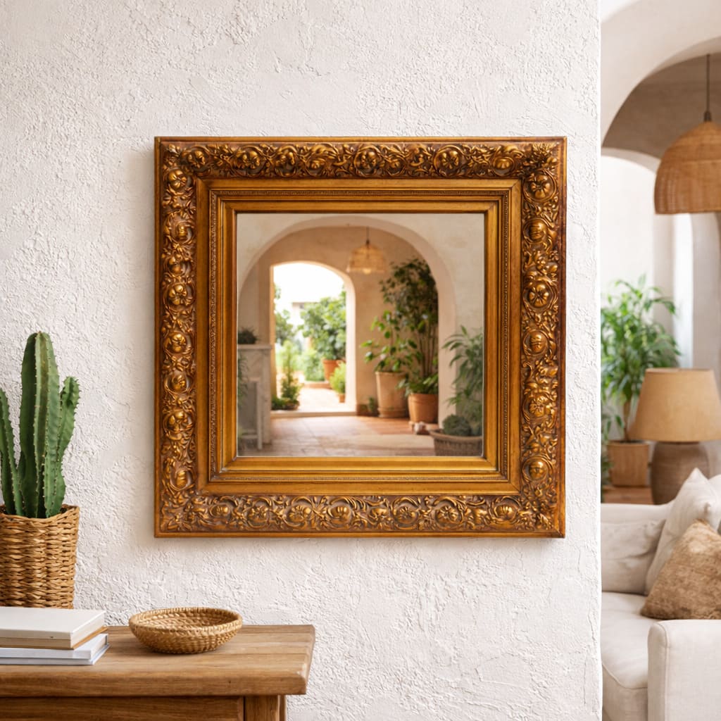 Espejo árabe tradicional de madera, cuadrado, en color dorado.