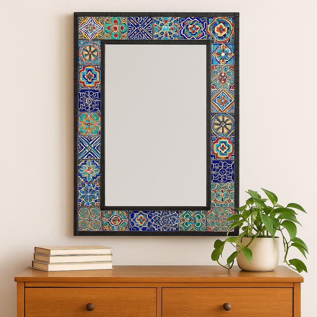 Espejo árabe de azulejos, fabricado en robusta madera de pino de 4cm de grosor. Estos espejos marroquíes estilo bereber son elegantes, modernos y sofisticados de diseño, concebidos para la decoración de salones árabes, pasillos y dormitorios de casa. Incluyen soportes por la parte posterior para colgarlos verticalmente, aunque se pueden adaptar para colgarse de manera horizontal.