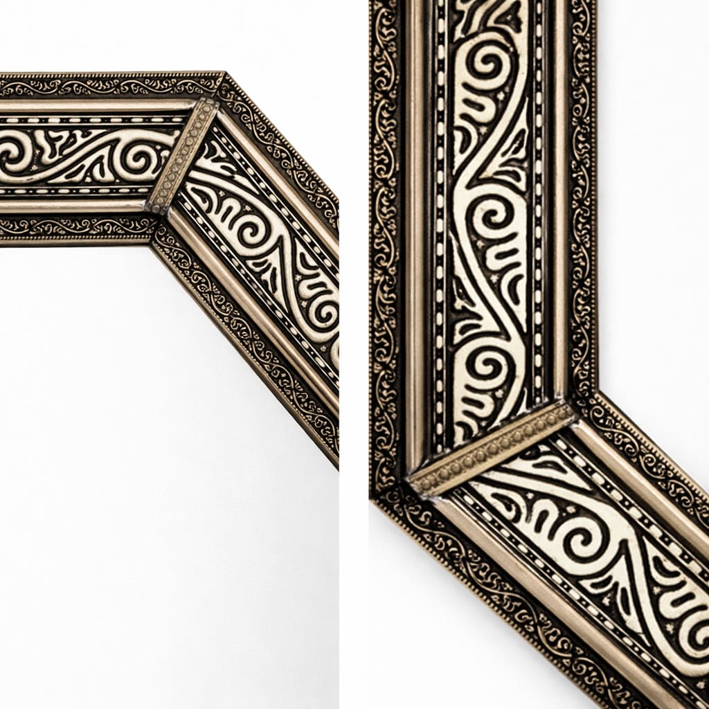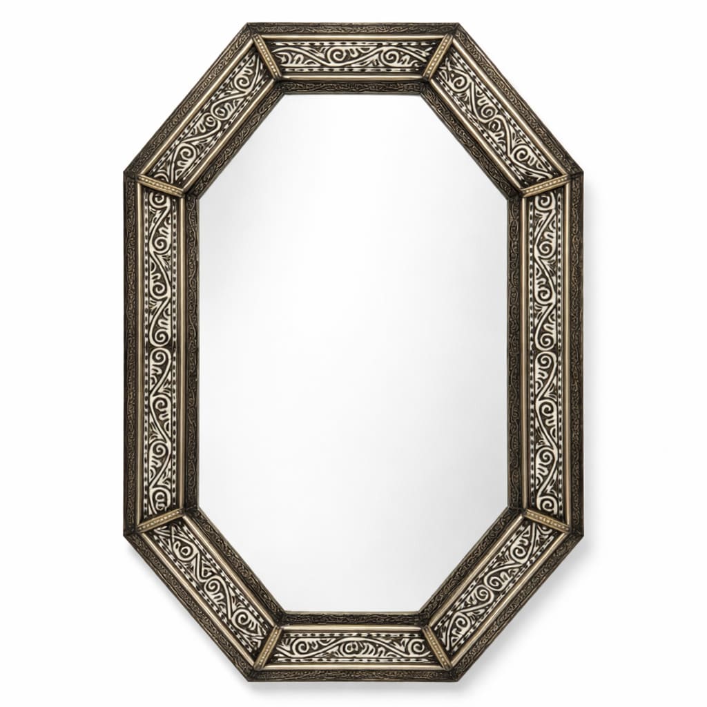 Espejo árabe de estilo octogonal, elaborado artesanalmente en alpaca tallada y resina. Se puede orientar tanto vertical como horizontalmente.