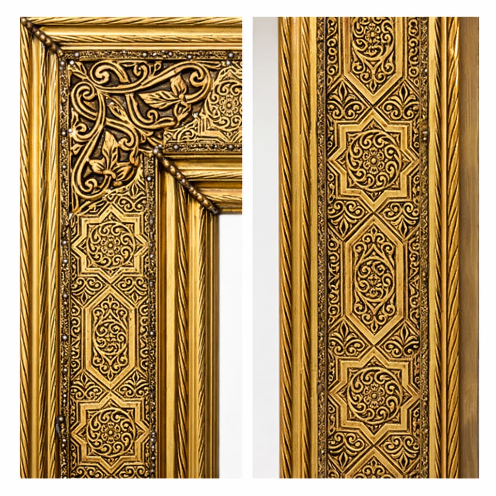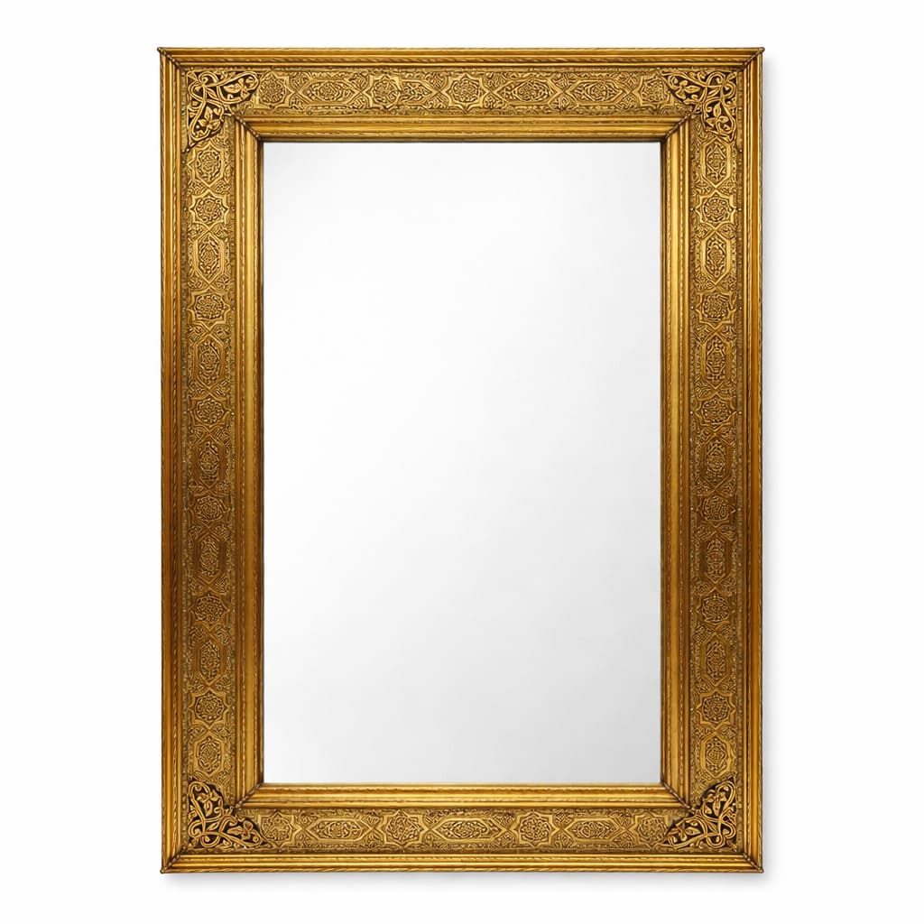 Espejo árabe de estilo moderno, de alpaca dorada, labrado artesanal. Diseño Ourika, inspirado en la geometría de Al-Andalus.