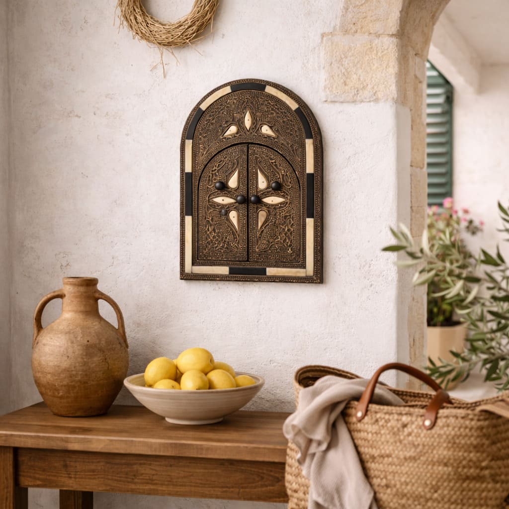 Espejo árabe de hueso modelo BOU REGREG, con puertas. Esta pieza especial está tallada a mano con hueso blanco y alpaca. Nuestros artesanos siguen métodos ancestrales para trabajar este tipo de espejo.