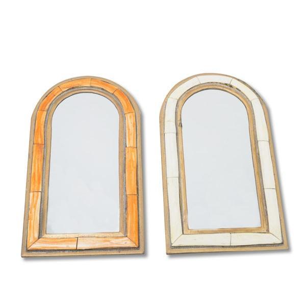 Espejo marroquí de alpaca dorada e incrustaciones manuales de hueso, en diferentes tonalidades, naranjas o blancas. Disponible en dos colores a elegir: blanco y naranja.