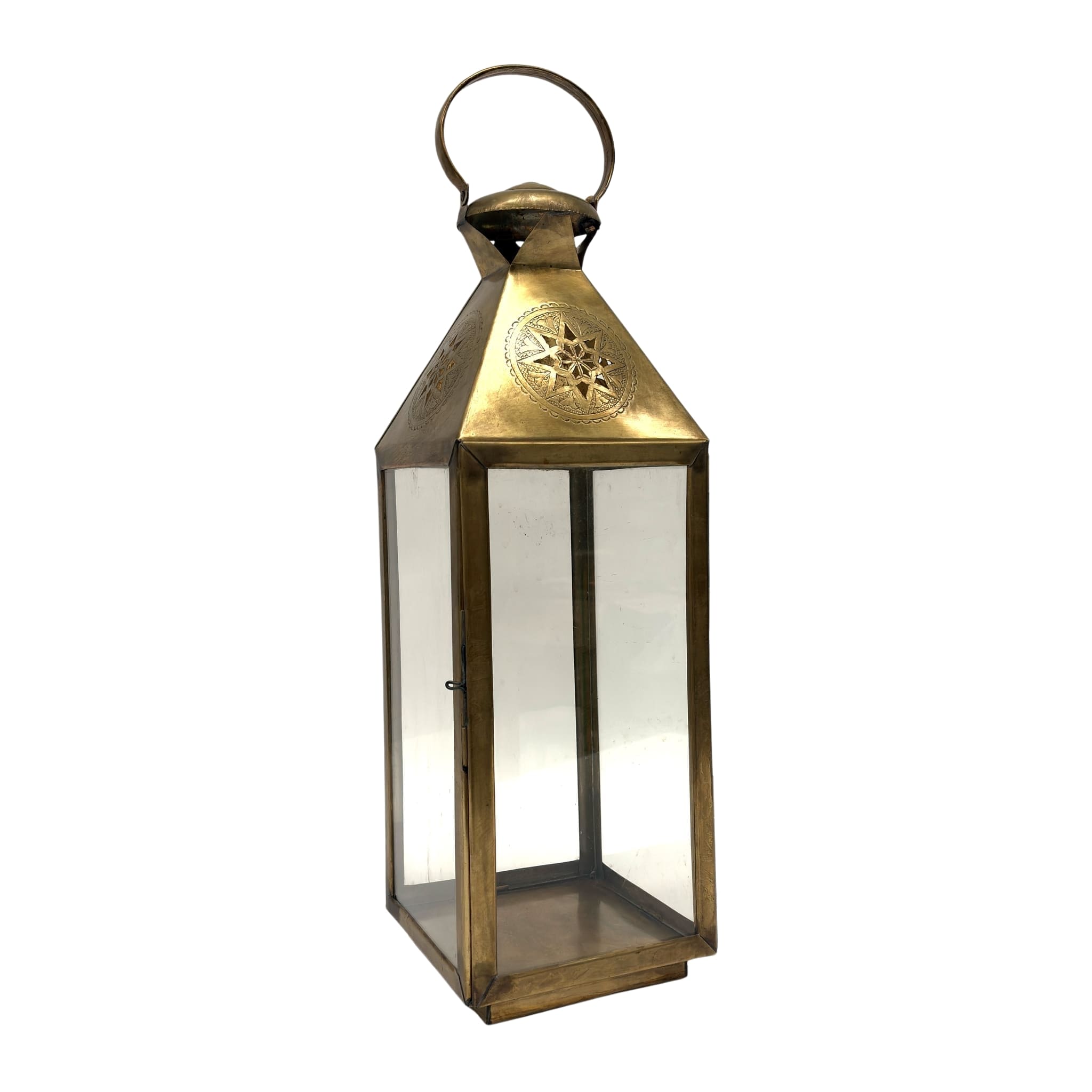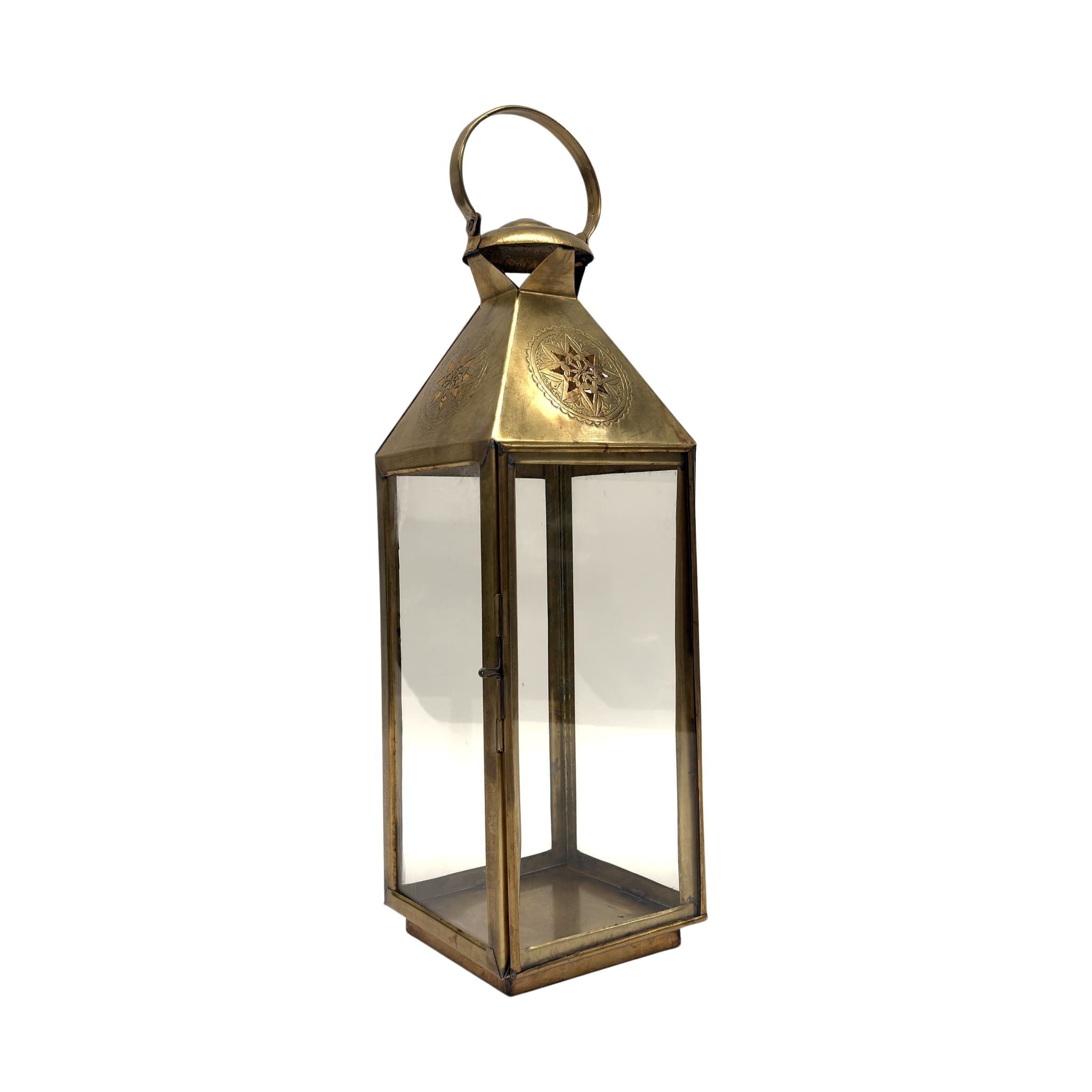 Farol árabe de cobre dorado para velones grandes. Elaborado artesanalmente en cobre dorado y cristales transparentes, este farol marroquí está concebido para exteriores o para decorar y ambientar el interior del hogar, jardines y terrazas.