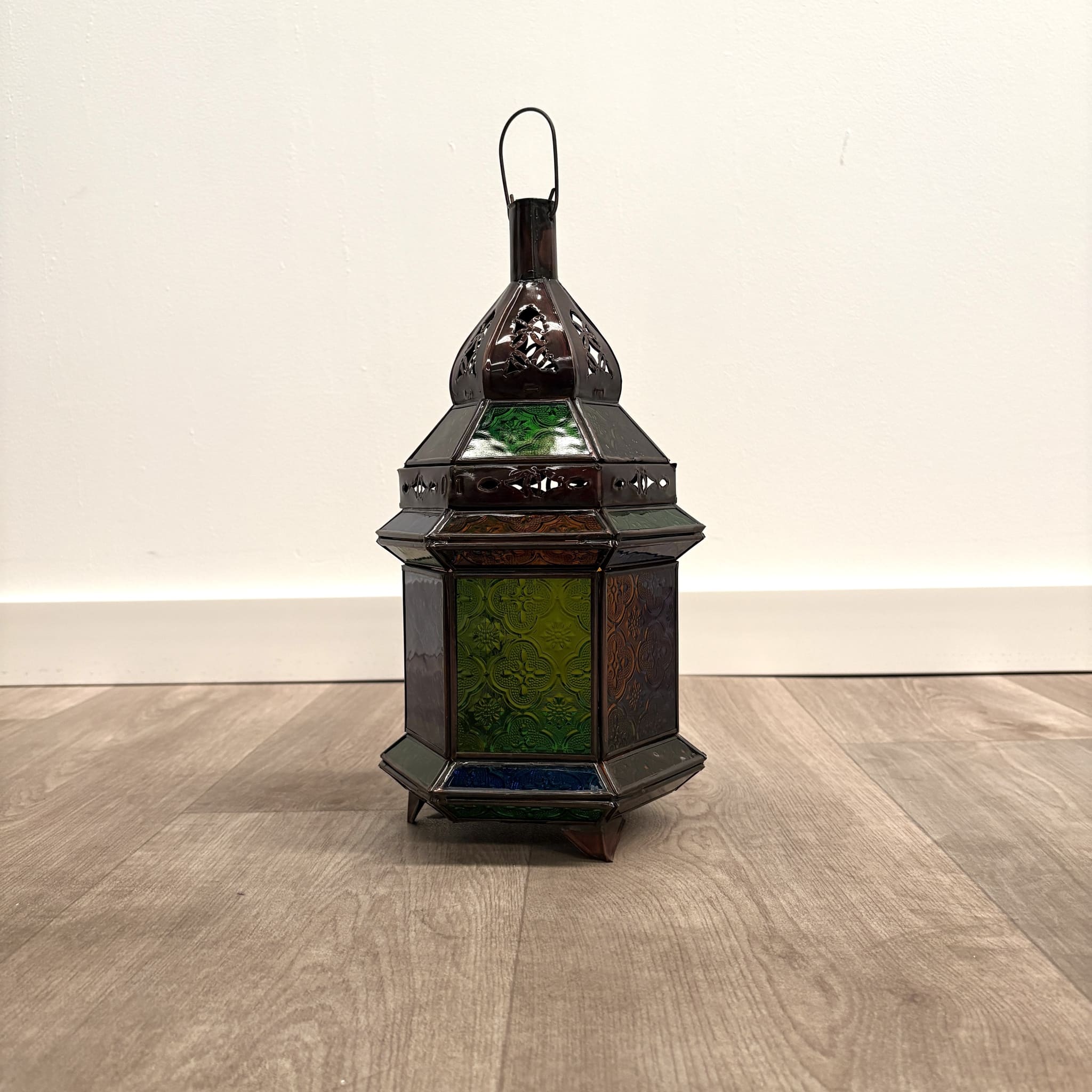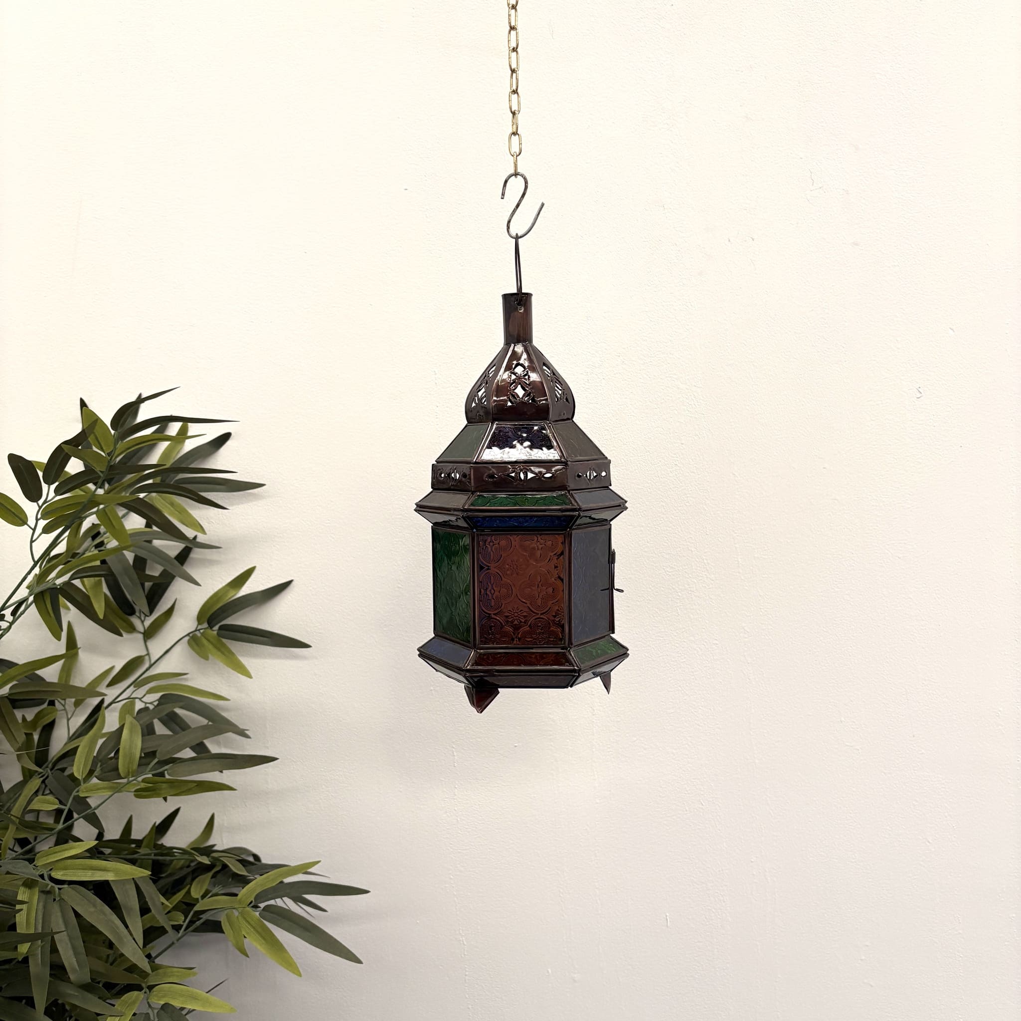 Farol árabe hexagonal, estupendo para generar un entorno cálido y de luz agradable al más puro estilo Marrakech. Sus hermosos cristales vidriados artesanales aportan el toque Al-Andalus a tus estancias favoritas.