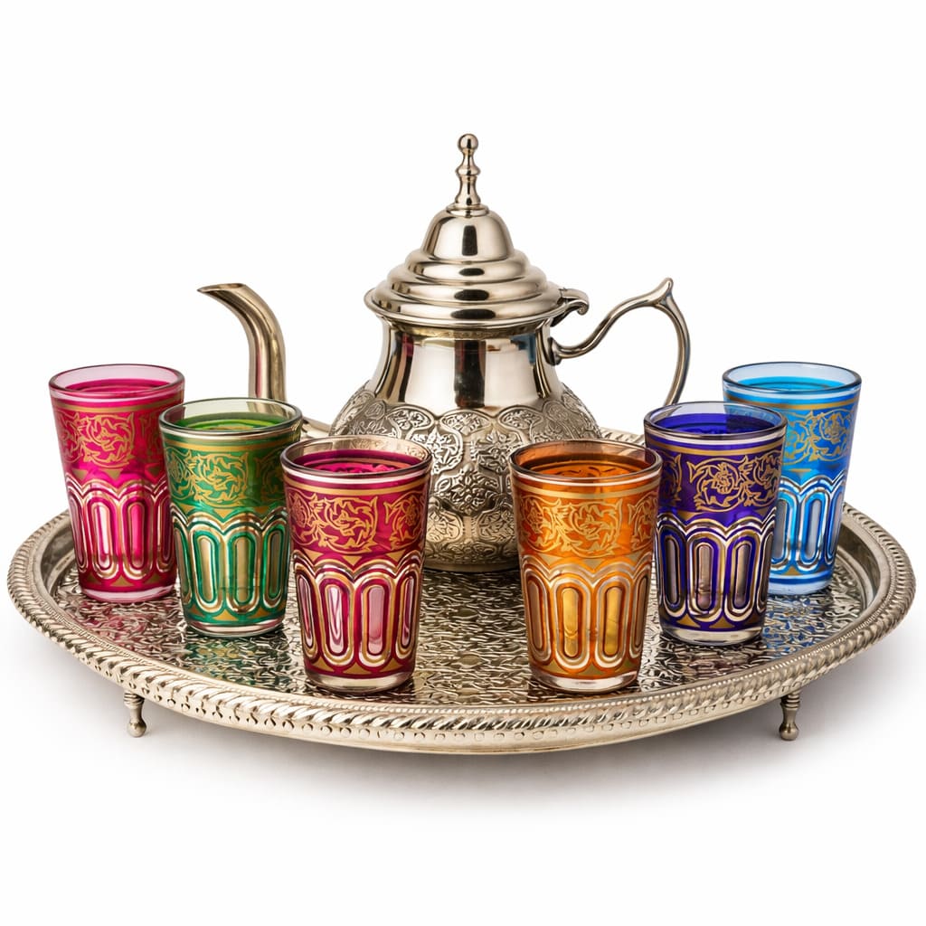 Juego de té marroquí estupendo para regalo. Para esa persona fan del té moruno y del mundo árabe el set de té árabe no puede fallar. El juego está compuesto por: Una bandeja marroquí de alpaca grabada a mano, un juego de 6 vasos marroquíes de la marca Fath en varios colores y una tetera marroquí de alpaca tallada a mano, con patas.