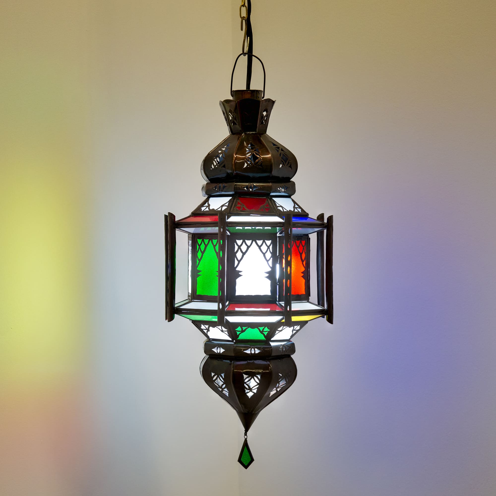 Lámpara marroquí de cristal octagonal con arcos andalusíes clásicos. Combina cristales vidriados de colores y cristales transparentes, que permiten un paso agradable y armónico de la luz y sus efectos.