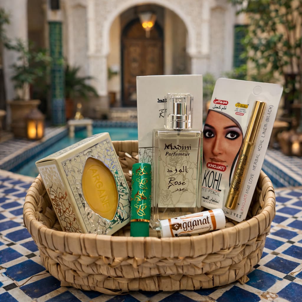 Cesta de cosmética árabe MADINI, compuesta por perfume artesanal de rosa 50ml, pintalabios mágico, bálsamo labial ARGANAT, pastilla de jabón de argán artesano MADINI 125g, lápiz de ojos khol KHOJATI.