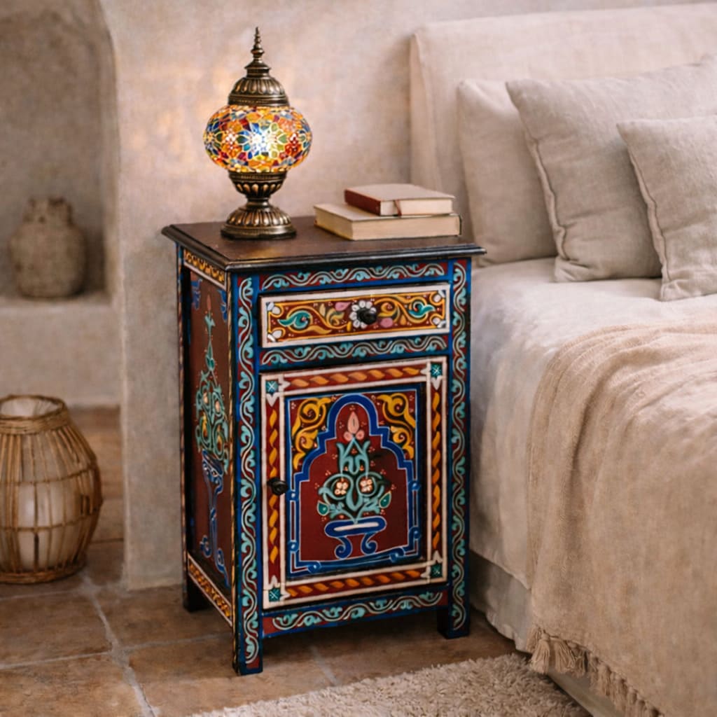 Mesita de noche árabe en color granate pintada a mano por nuestros artesanos, dibujada con motivos florales y geométricos artísticos muy coloridos. Dispone de un cajón y un compartimento interno.