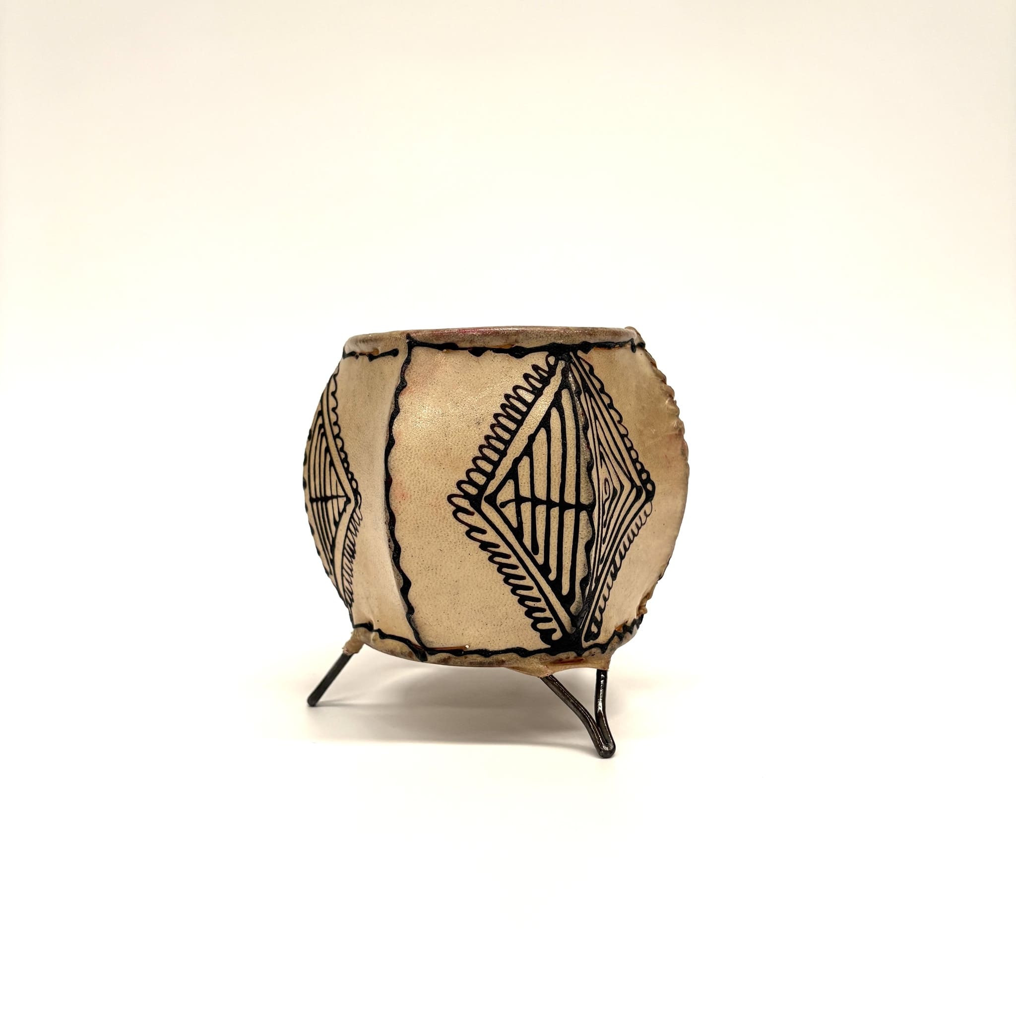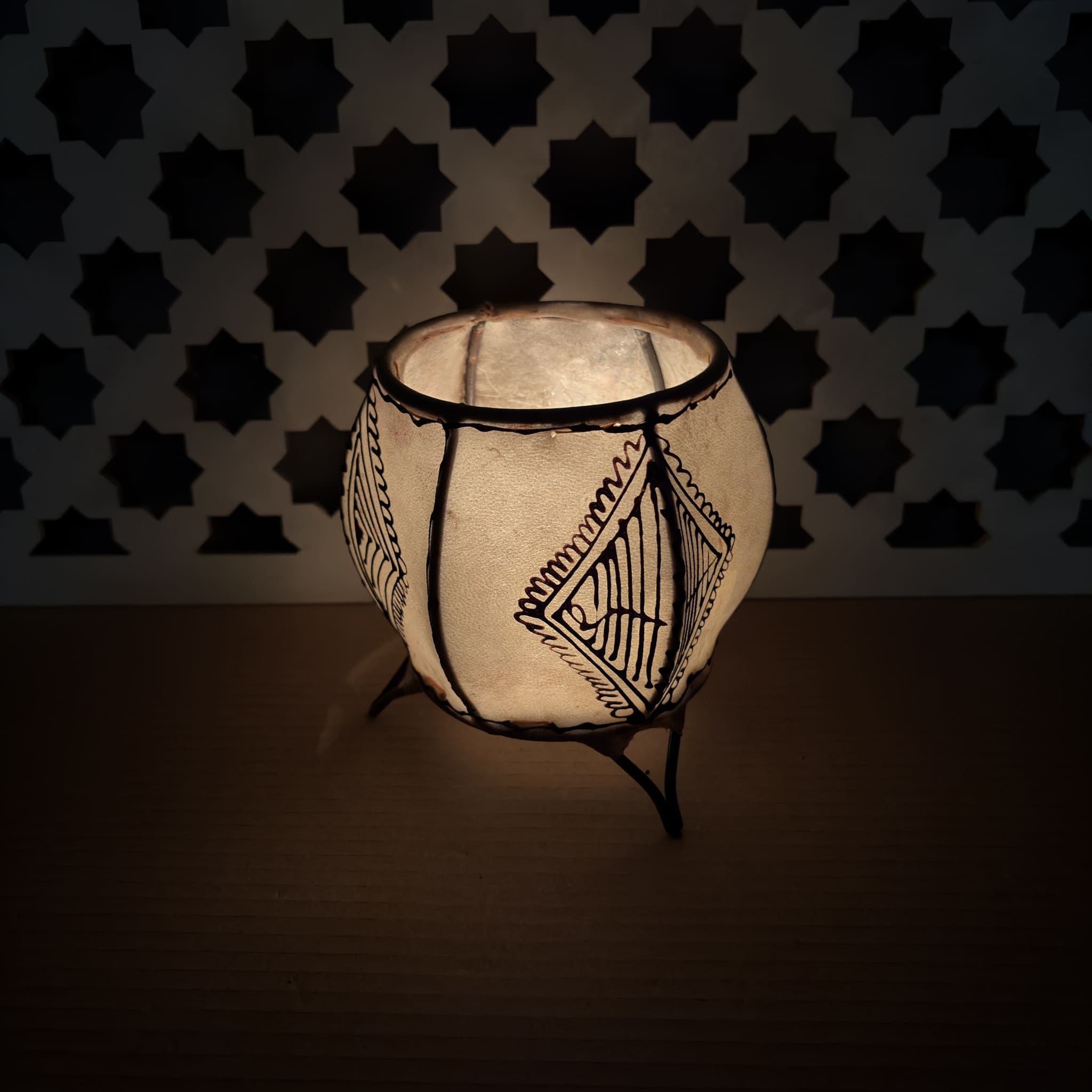 Portavelas Marroquí de piel en color natural, pintado a mano con henna. Ideal para tus dormitorios y estancias del hogar, aporta un toque handmade auténtico con una luz agradable.