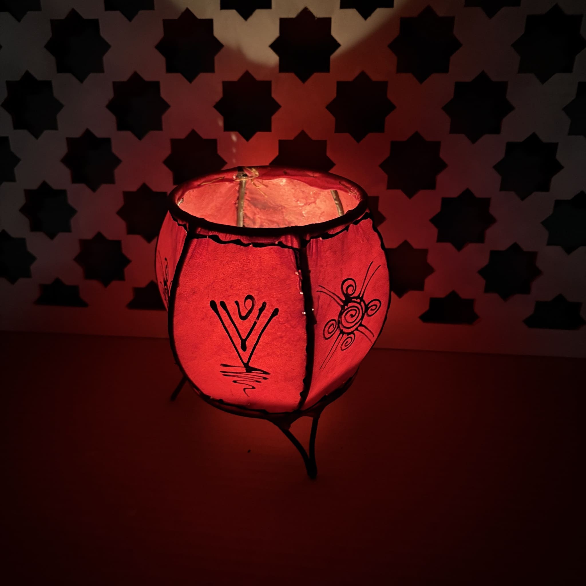 Portavelas marroquí de piel pintado a mano con henna. Genera una iluminación agradable y aporta ese estilo decorativo moruno, de carácter cálido y 100% handmade a tus estancias, dormitorios y pasillos.