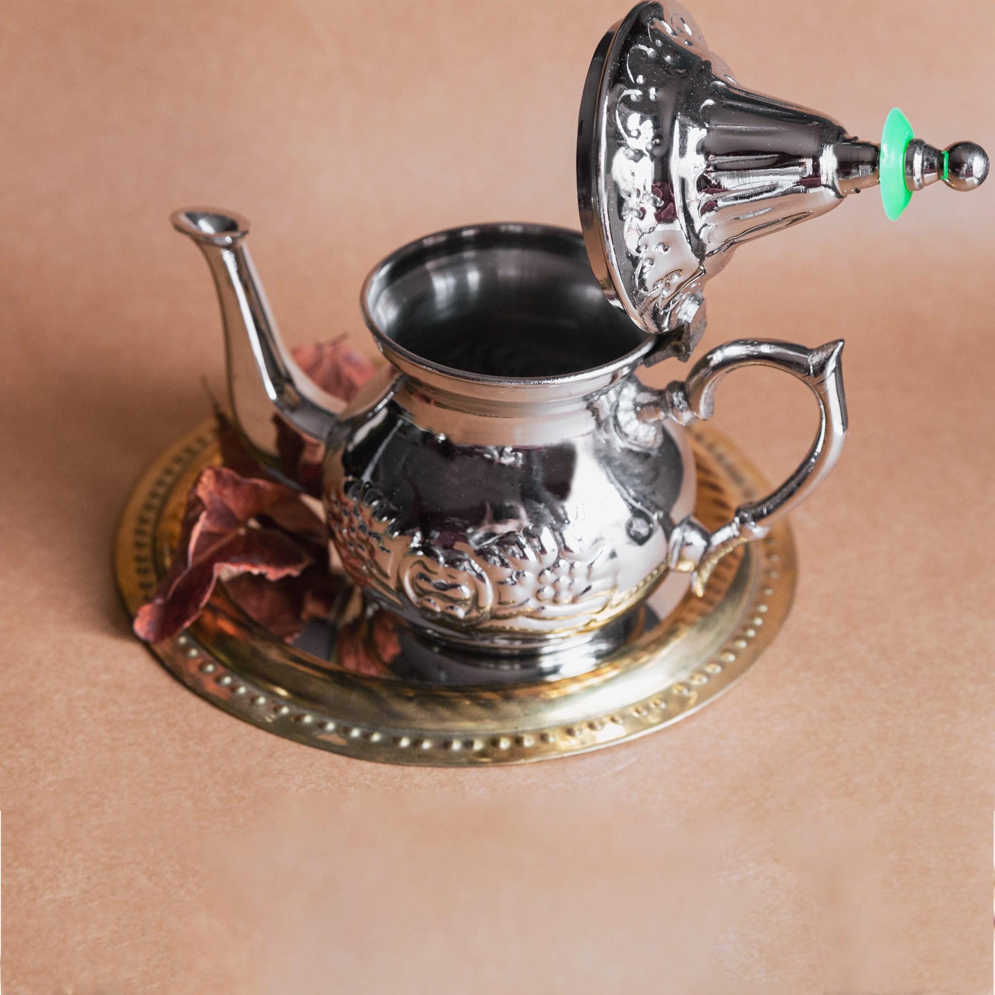 Tetera árabe de acero inoxidable, modelo con estilo marroquí y motivos florales. Ideal para preparar el té moruno y tus infusiones favoritas. Tetera muy consistente y duradera, apta para vitrocerámica y demás sistemas eléctricos de cocina.