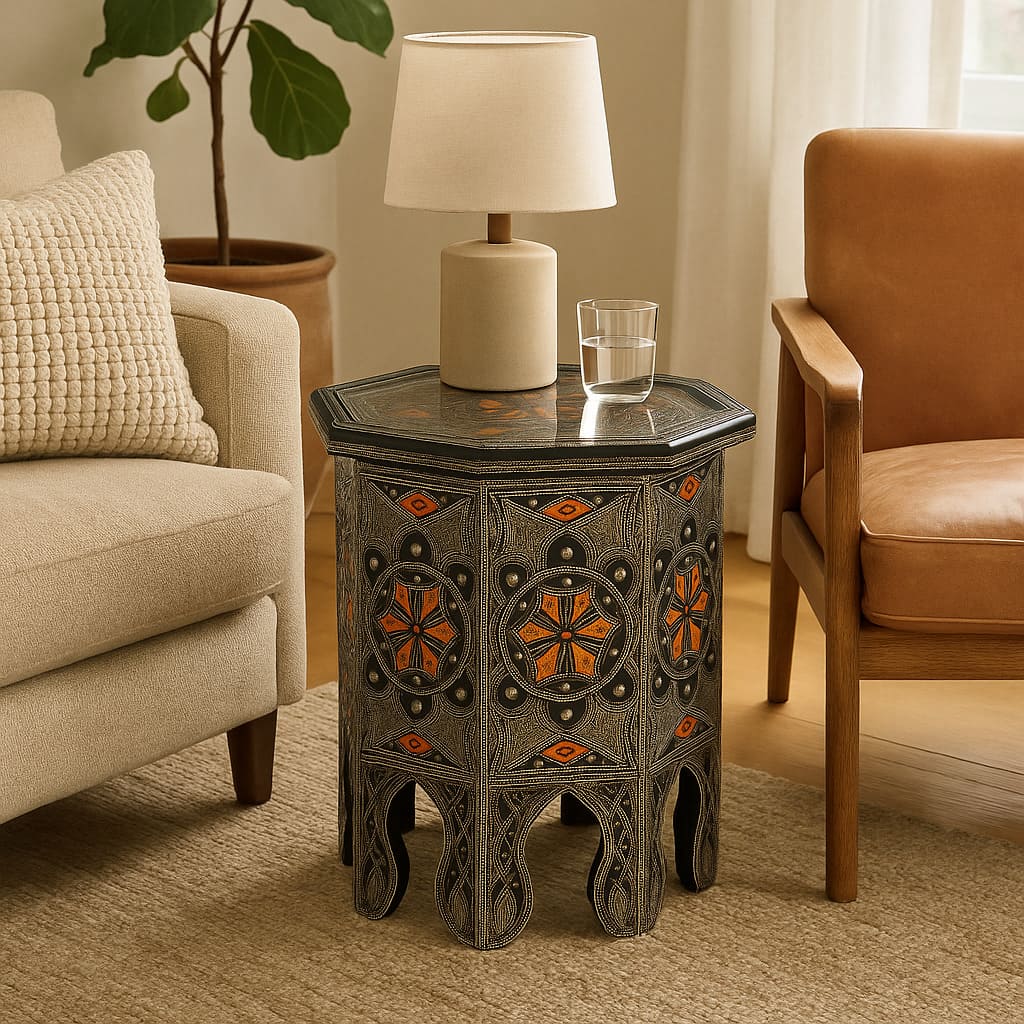 Mesa marroquí artesanal, elaborada minuciosamente con alto nivel de detalle, destaca tus estancias con un impresionante repertorio de figuras geométricas talladas a mano por los artesanos. Incrustaciones de hueso natural 100% colocado pieza por pieza.